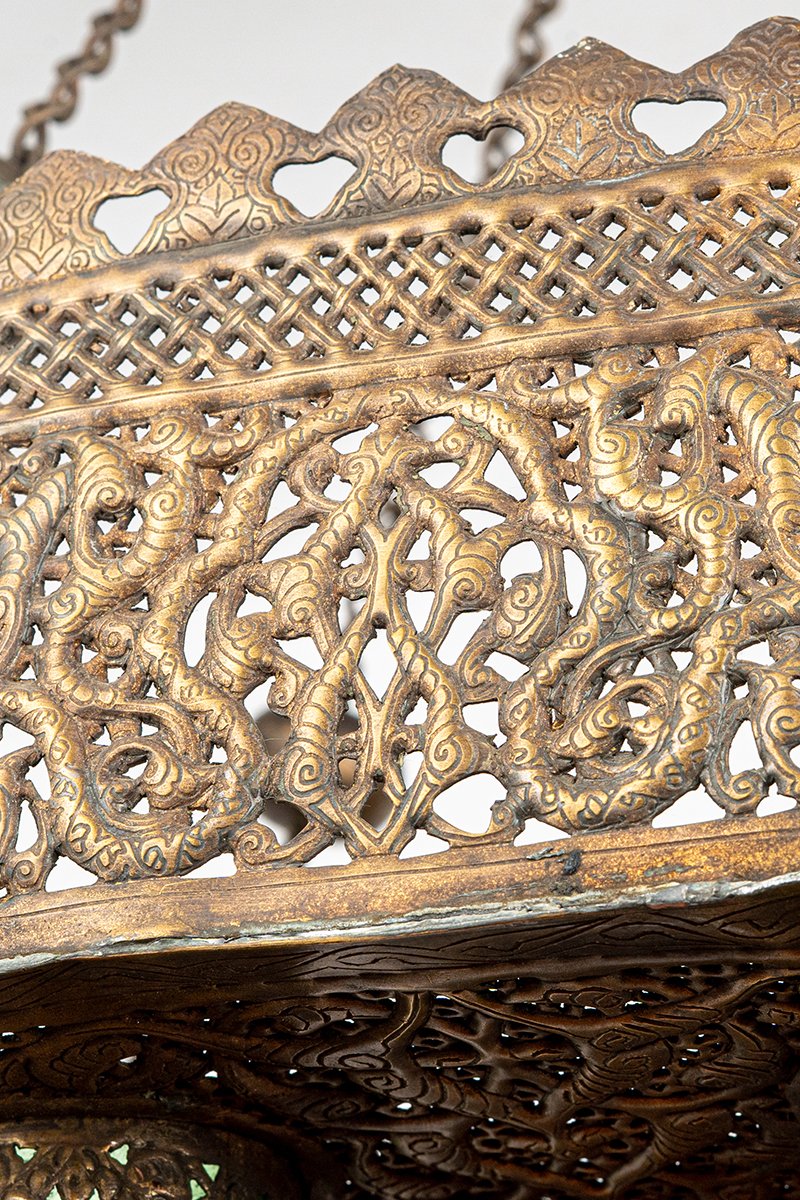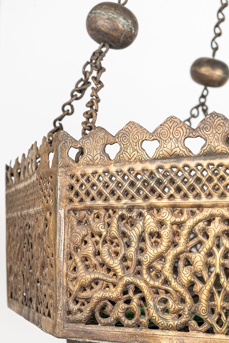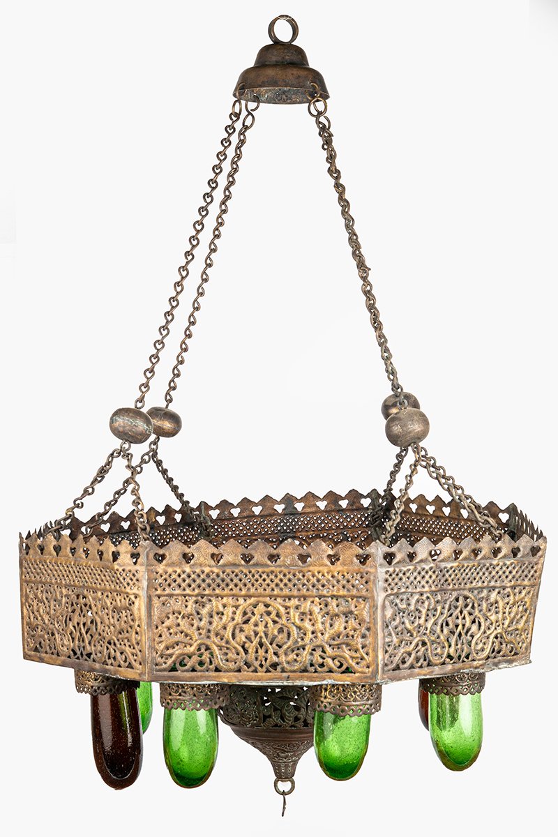 • Colored Glass Capsules: Green and amber glass vessels descend around the inverted dome, each cupped within finely cut brass collars. When lit with candles or oil, they would scatter jewel-like pools of color through the latticework.