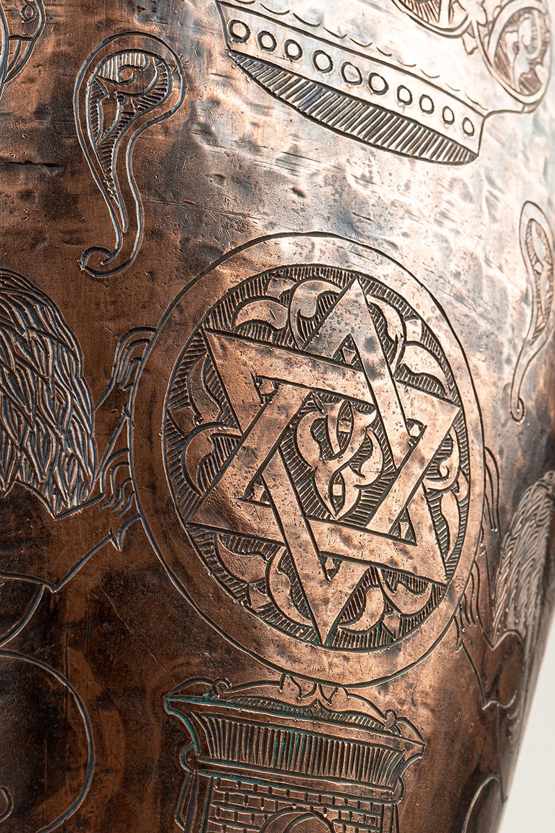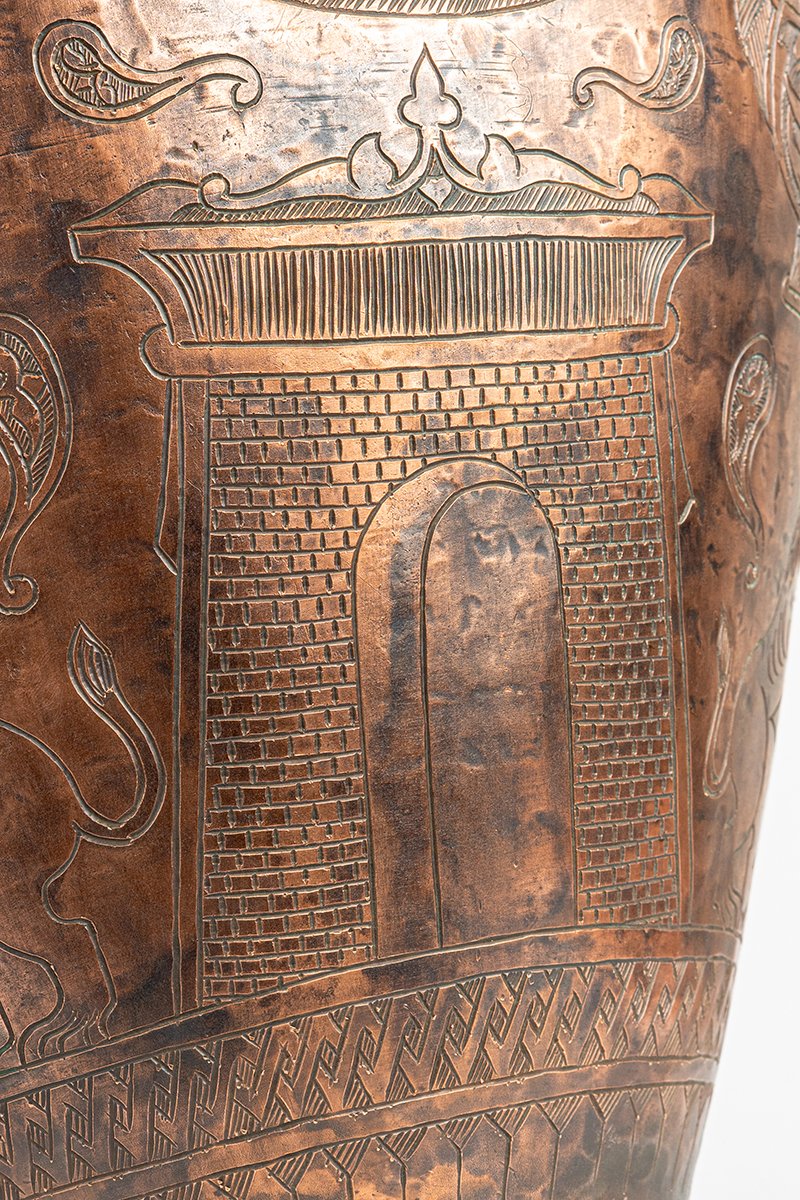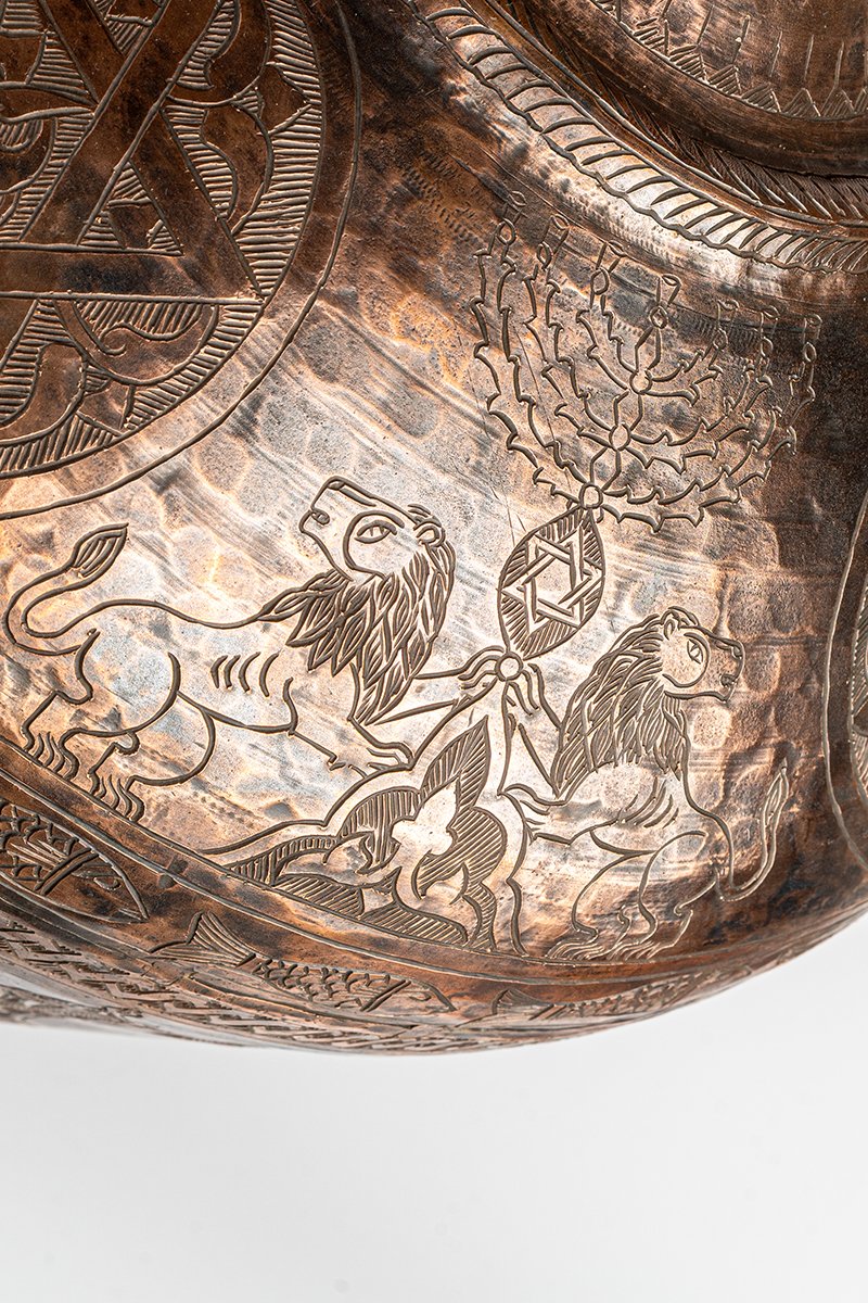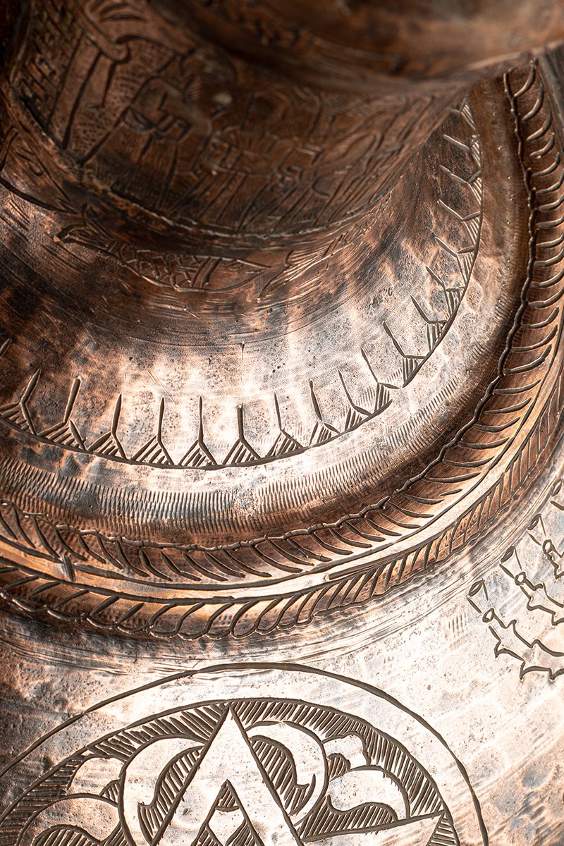 This monumental copper ewer is not a mere vessel for pouring; it is a cosmos of hammered metal, its surface inscribed with symbols of sovereignty, protection, and sacred continuity. Every motif serves as both ornament and proclamation, binding heavenly order to earthly authority.