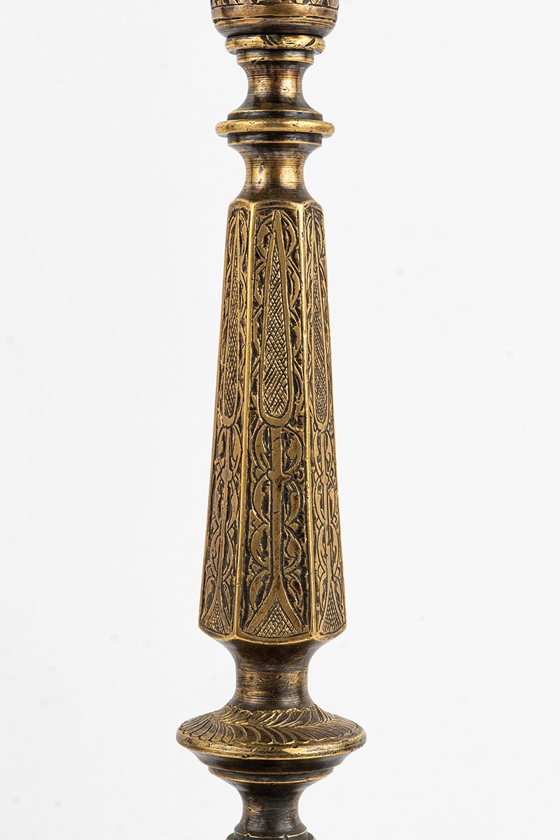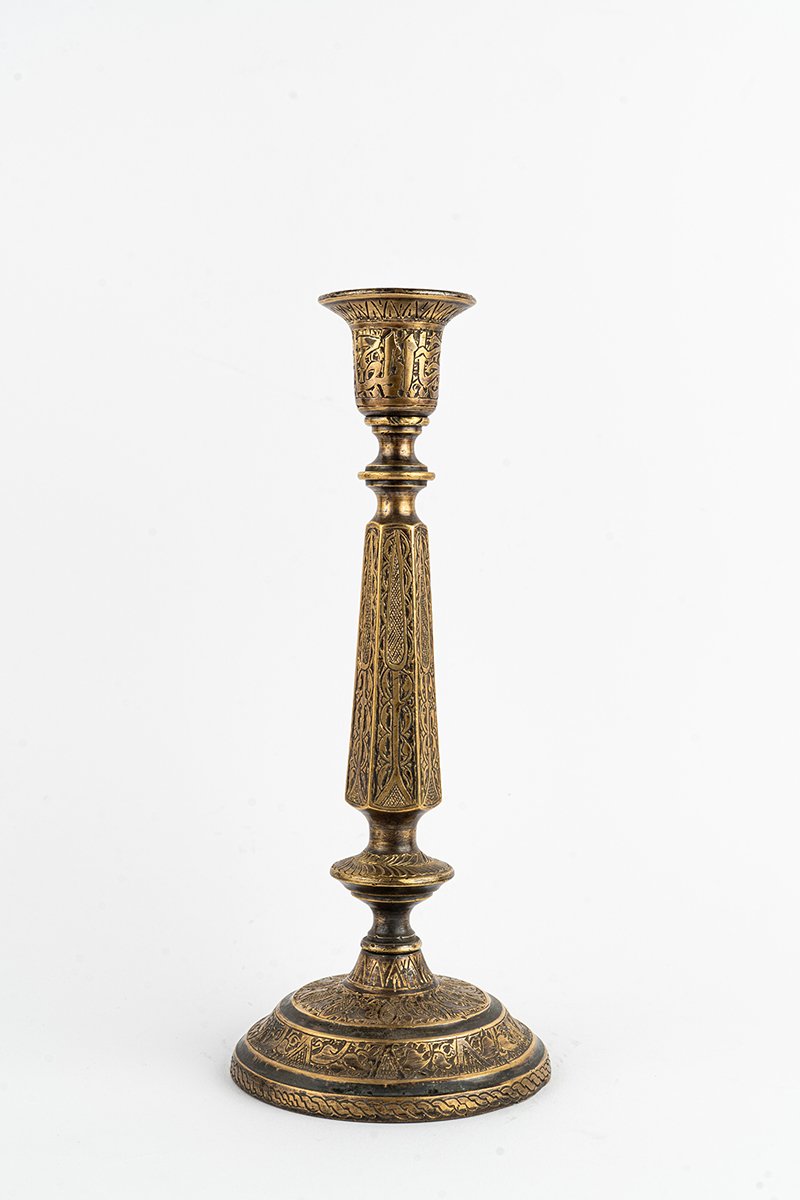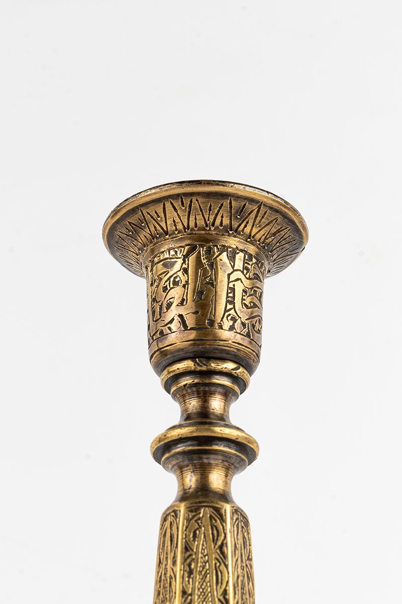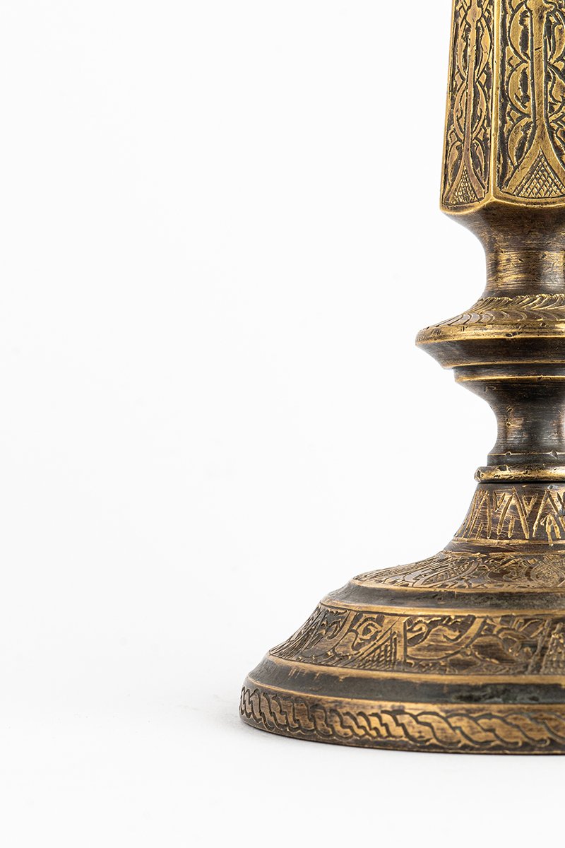 This tall brass candlestick is a masterwork of proportion, balance, and ornamental detail, embodying the Fatimid tradition of uniting utility with meaning. Rising from a tiered circular base, its form ascends with grace, culminating in a flared cup designed to carry not only flame but also symbolism.