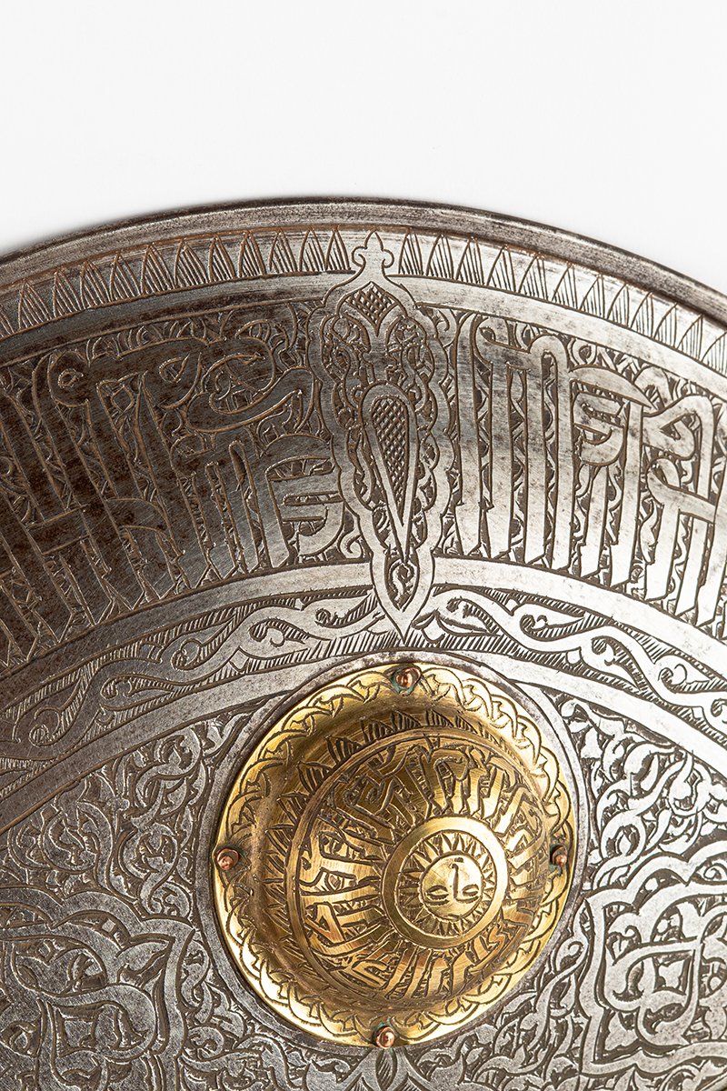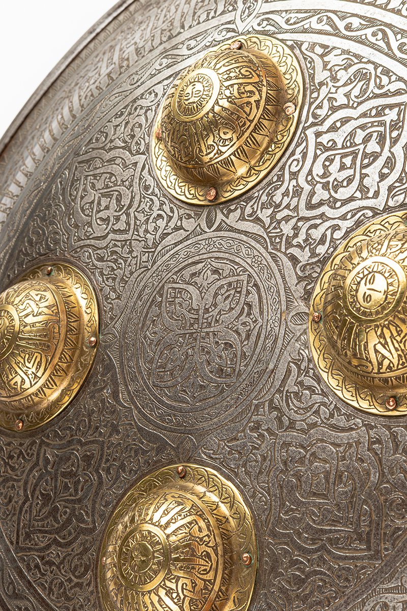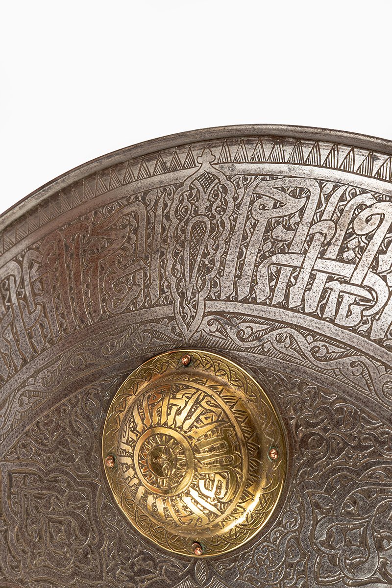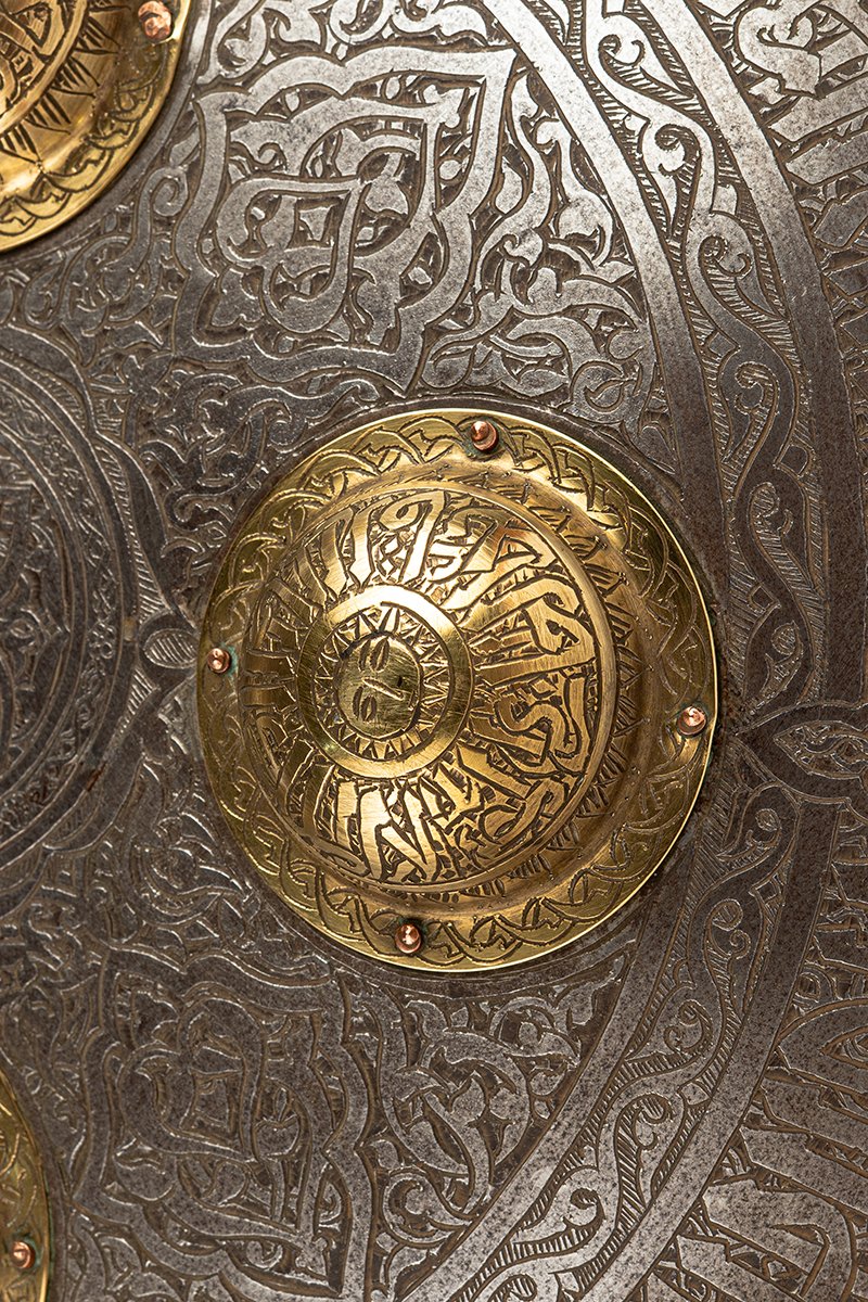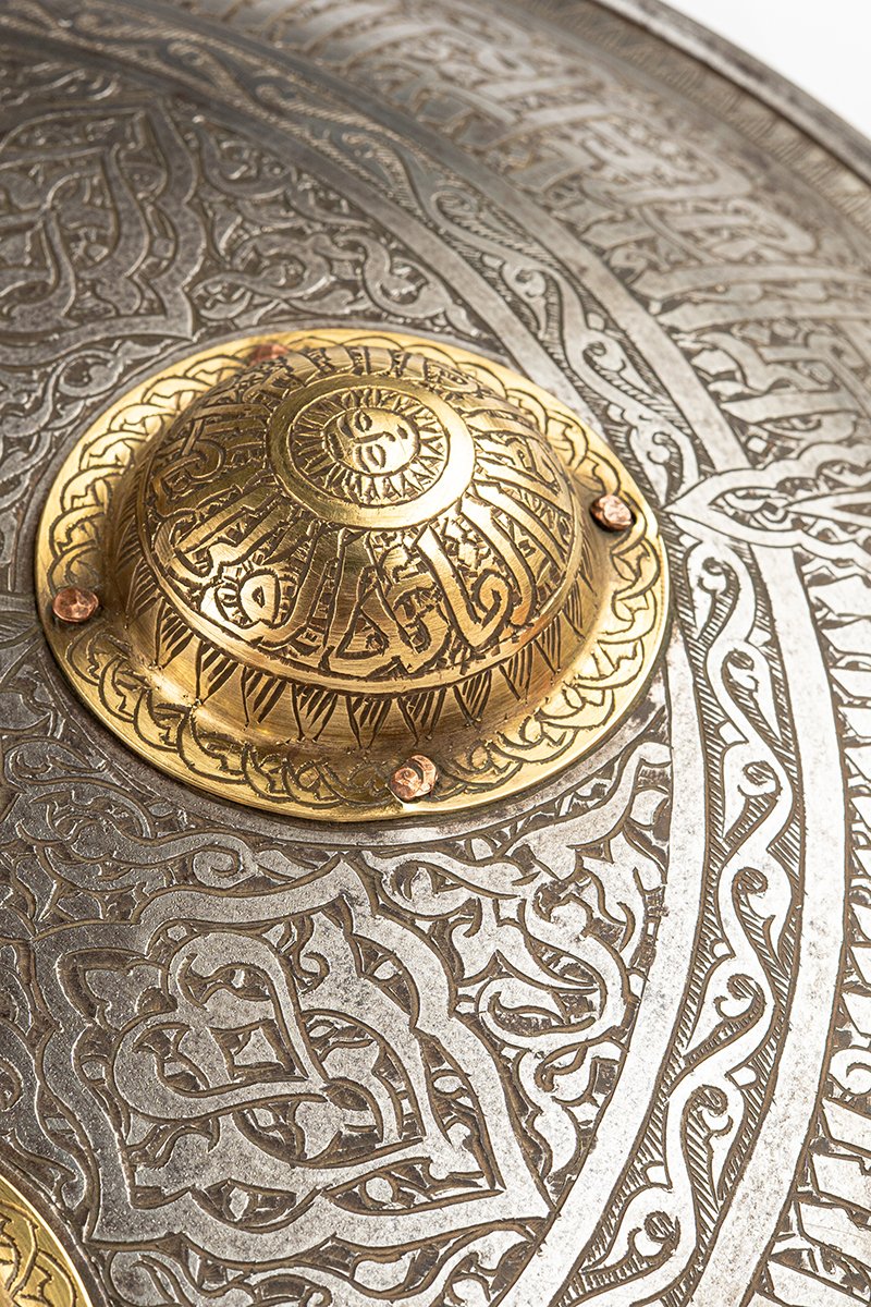 Flowing across the concentric bands are Qur’anic invocations and praises, rendered in bold script that merges text with ornament. Each boss carries its own inscribed invocation, turning the shield into a talisman of protection as much as an instrument of war.