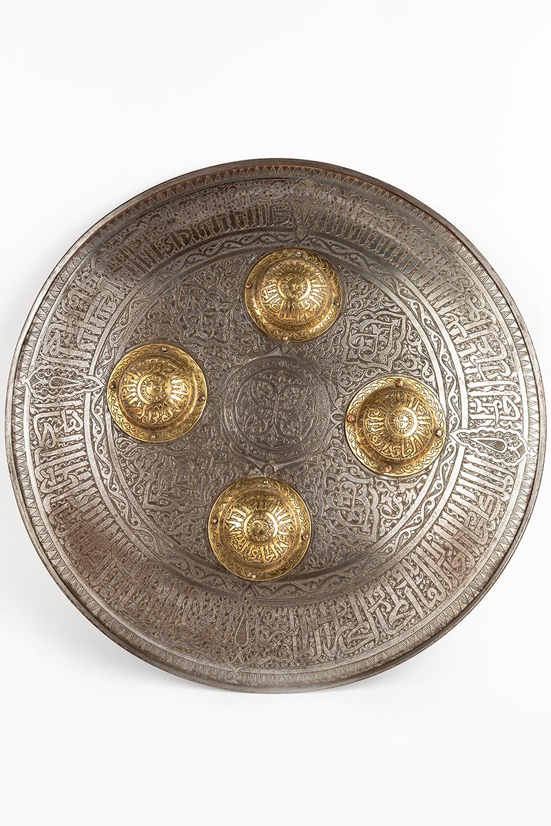 This Mamluk-style shield (dhal) embodies the duality of weapon and artwork, forged in steel yet transformed into a luminous surface of devotion and power. Its circular face is richly engraved with arabesques and Qur’anic inscriptions, arranged around four raised golden bosses that gleam like radiant suns set against a silver horizon.