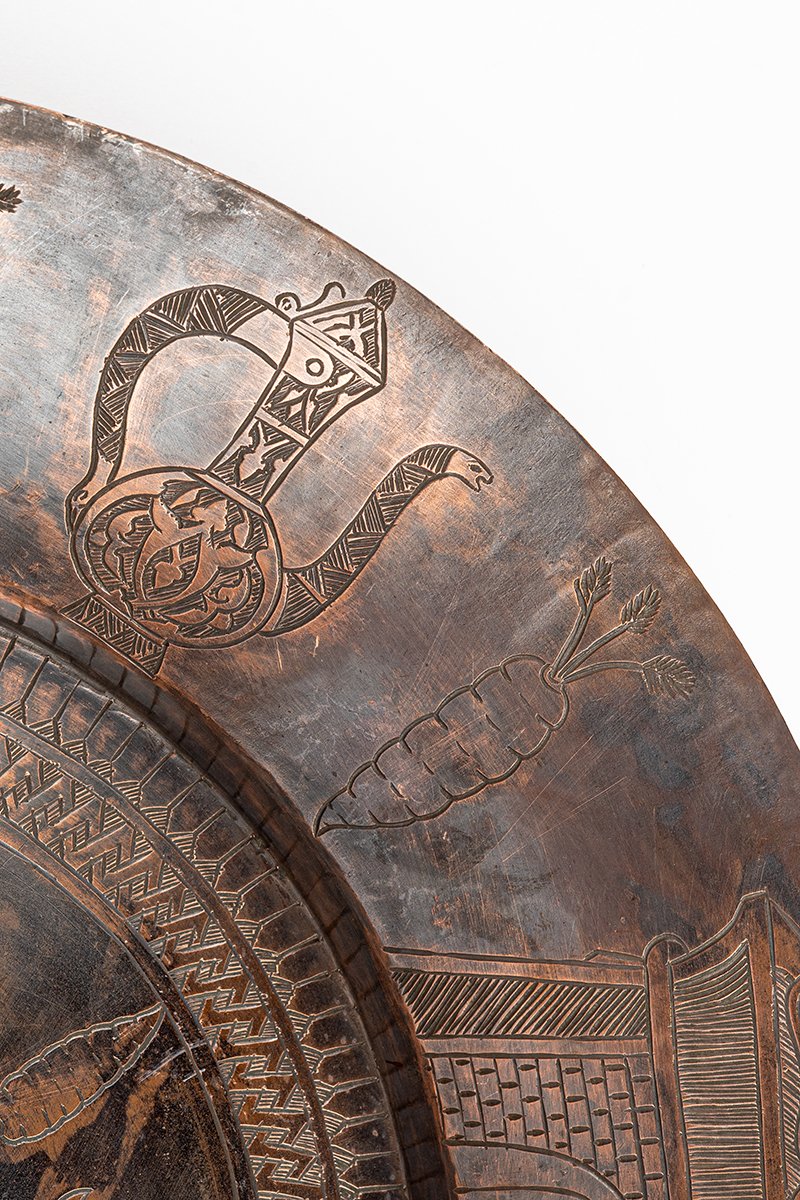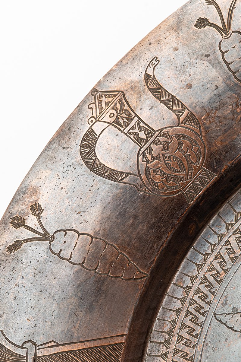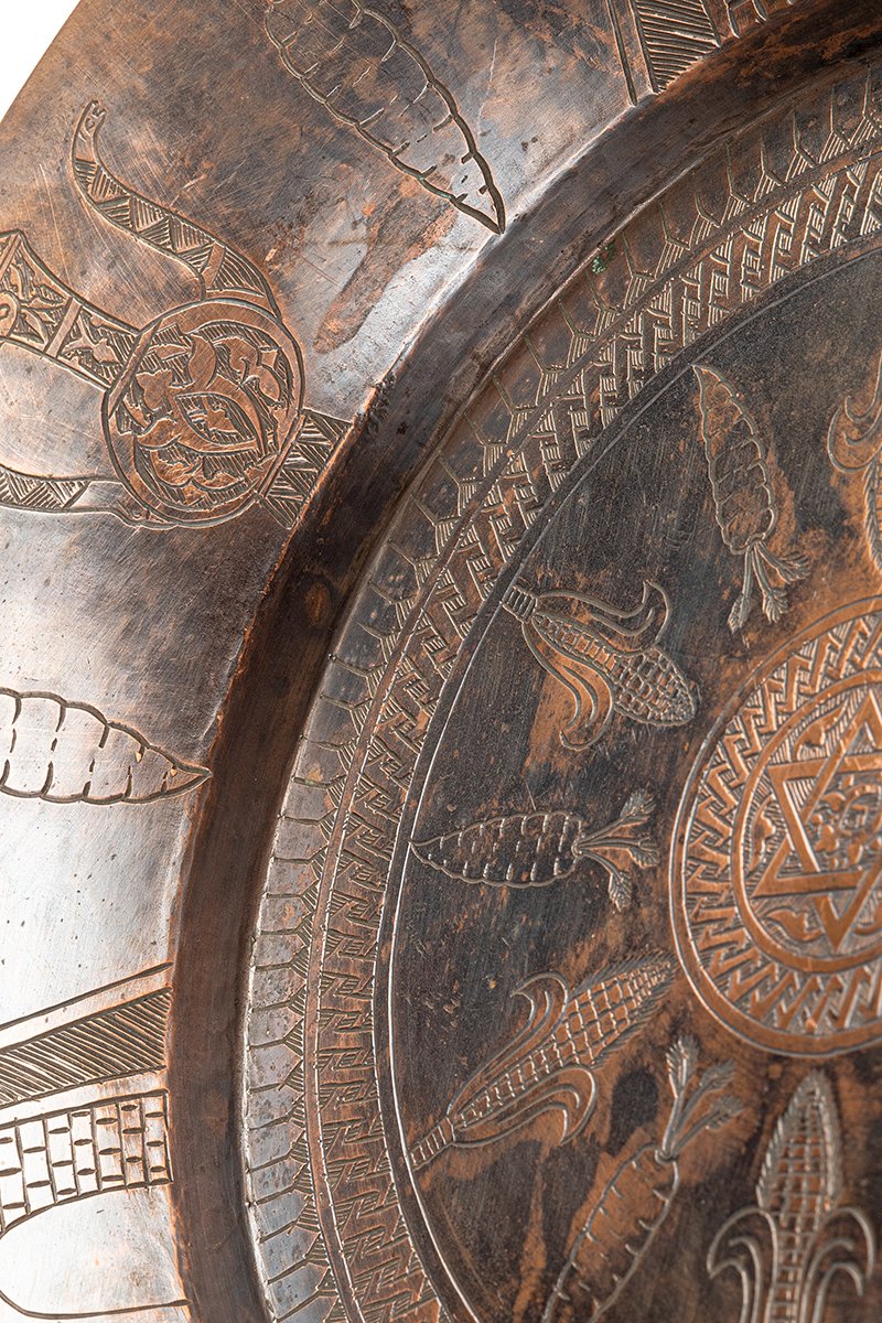 This engraved copper tray unites geometry, agriculture, and ceremony into a layered vision of prosperity and cultivation. Its surface reads as a manuscript in metal, where calligraphy, vegetal symbols, and architectural motifs speak together of sustenance and sacred order.