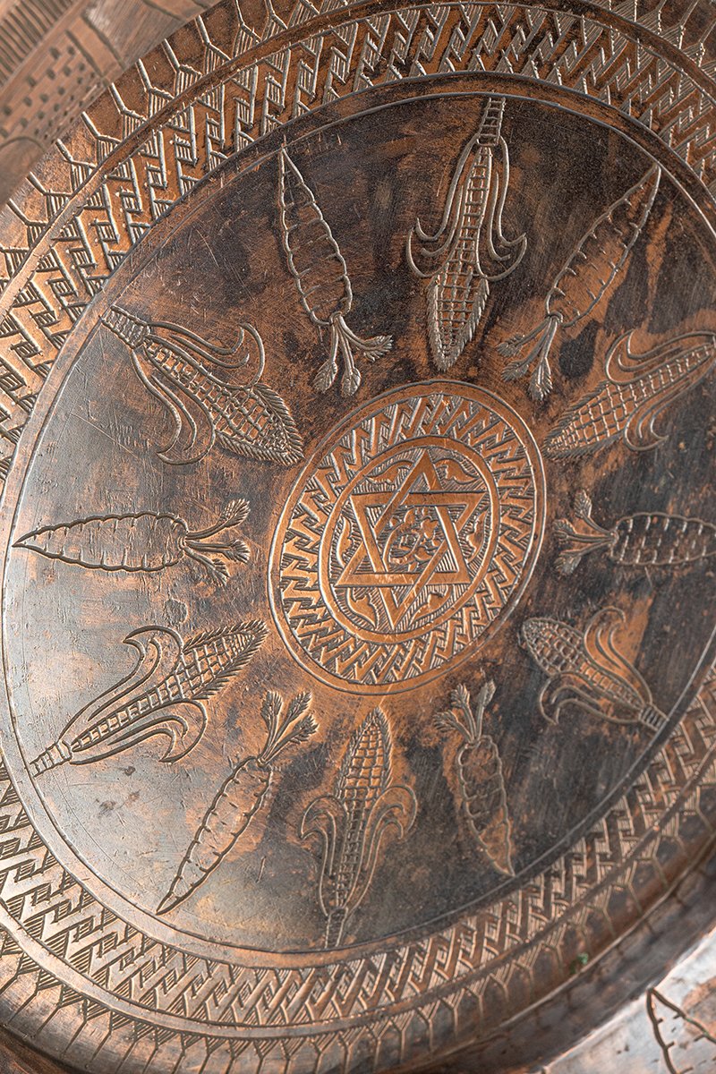 This tray embodies a dual character: both ceremonial and utilitarian. The central star situates fertility and blessing at the axis of creation, while corn, carrots, vessels, and gates extend the narrative of prosperity, cultivation, and passage. As a household or shrine object, it would have proclaimed abundance and divine sanction, tying the rhythms of agriculture to the architecture of faith.