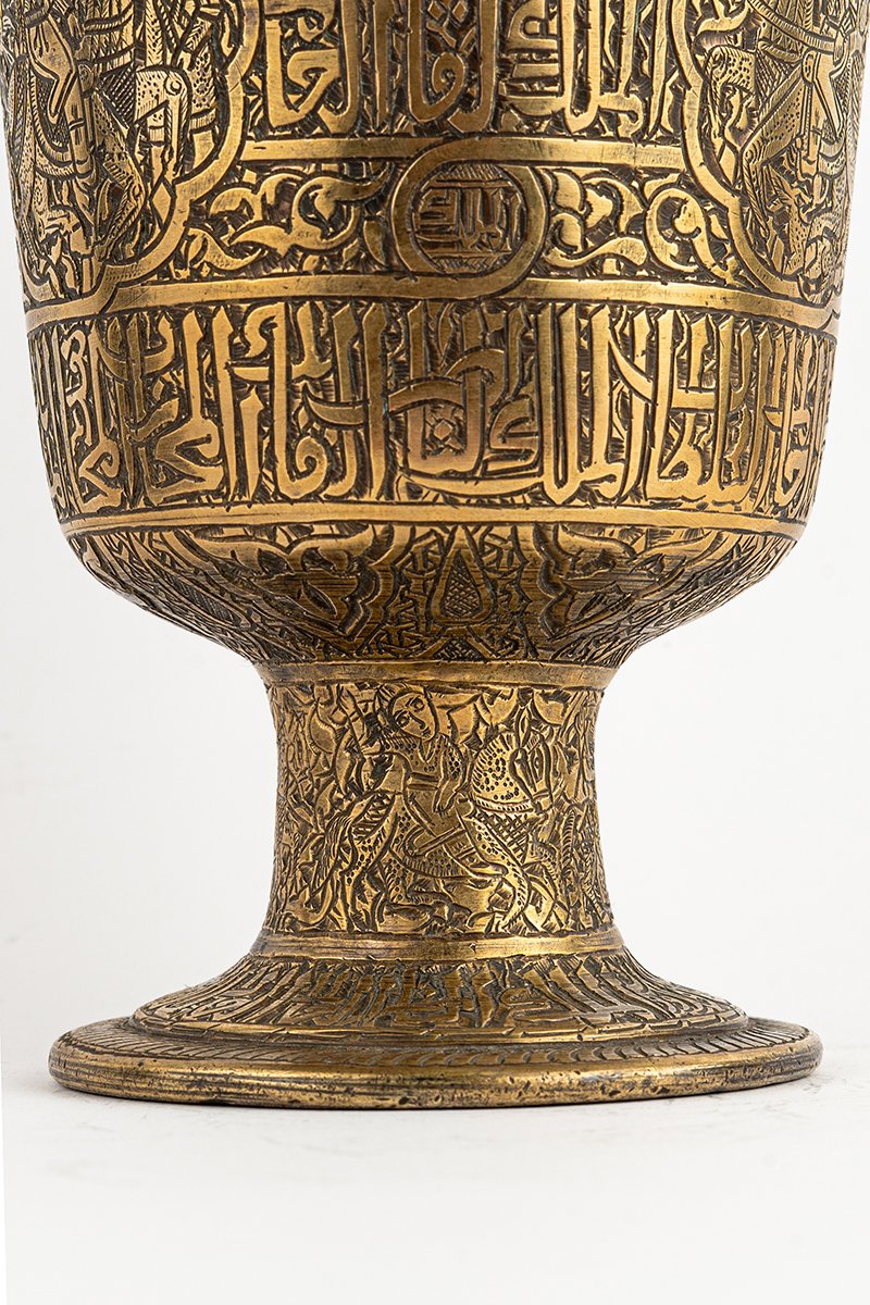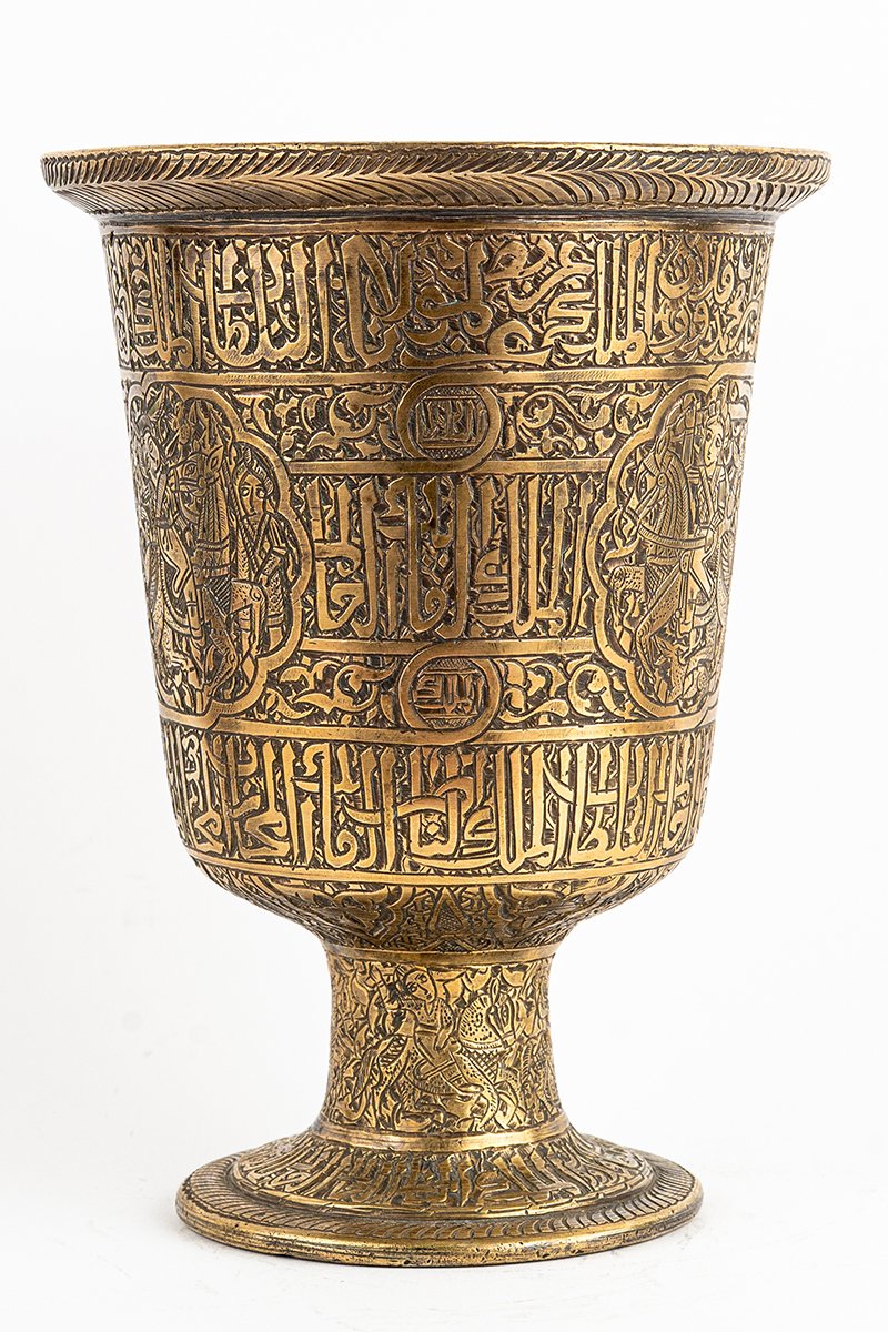 Encircling the goblet are bold registers of Mamluk-style inscriptions, proclaiming praises and royal titles: