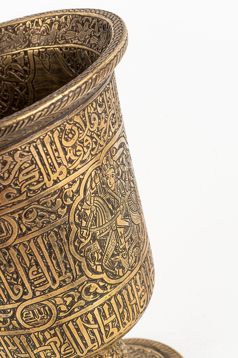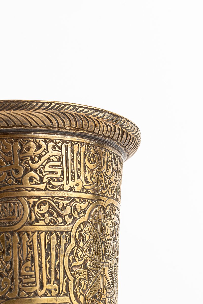 This goblet is more than a drinking vessel; it is a ceremonial manuscript in metal. The inscriptions exalt Sultan Muḥammad ibn Qalāwūn, while the medallions recount scenes of power and valor. The geometric and vegetal frameworks bind these voices together into a vision of endurance and legitimacy. With its pestle, the piece embodies both utility and ritual presence, serving as an object of prestige that carried the echoes of artistry, myth, and sovereignty into the gatherings of the Mamluk court.