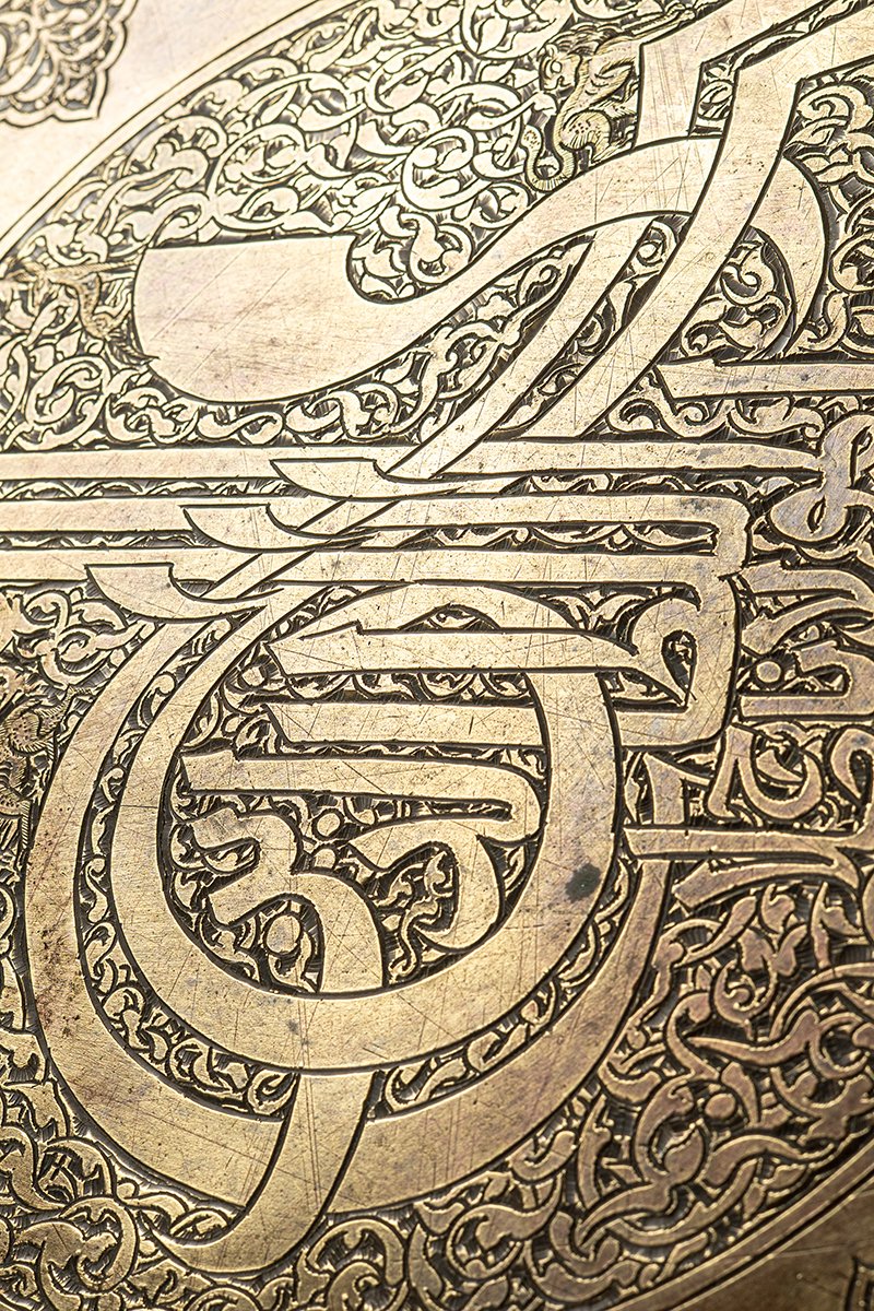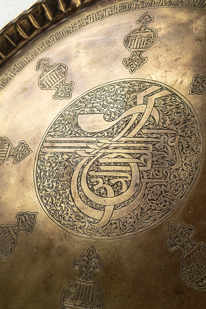 Surrounding the core, four large cartouches symmetrically display inscriptions in refined Arabic calligraphy, reinforcing balance and grandeur. At the edge, a continuous band of script encircles the tray, spreading blessings and legitimacy outward like a radiating halo. The rim, ridged with architectural precision, resembles fortress walls, guardians of what lies within.