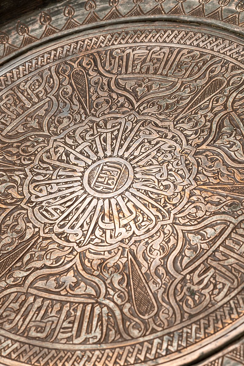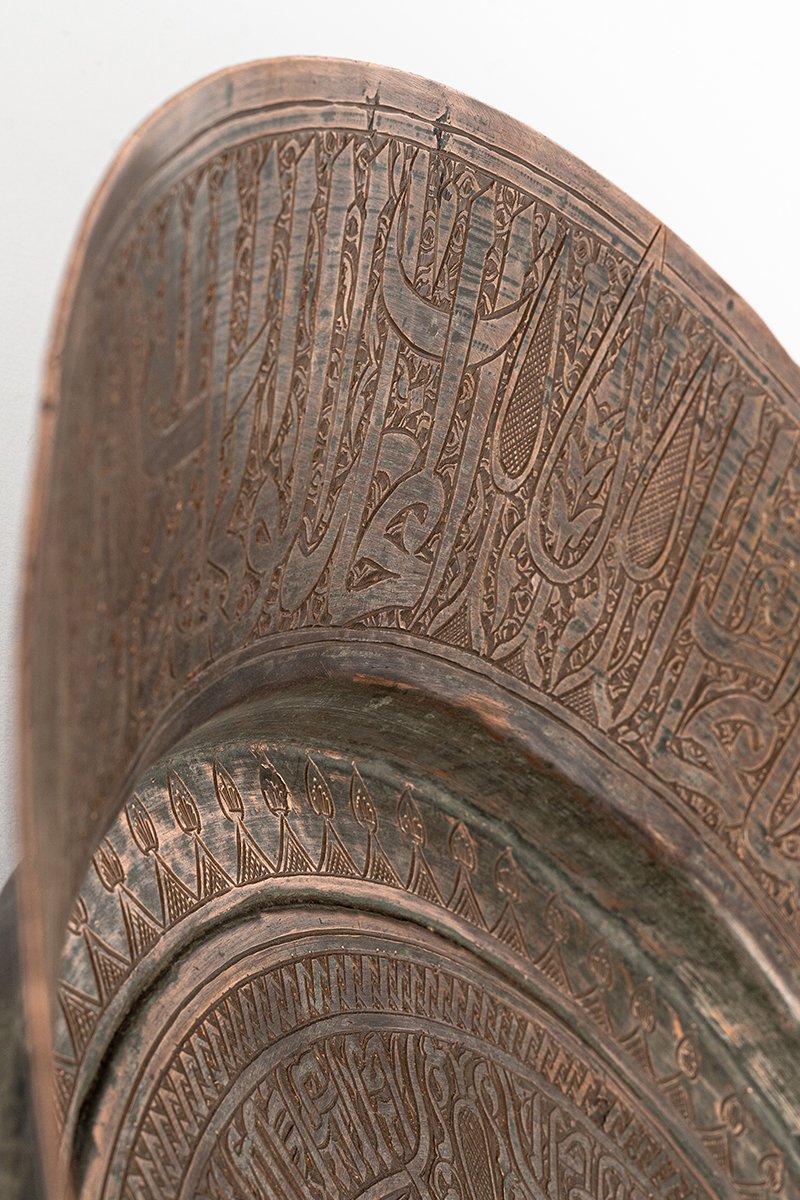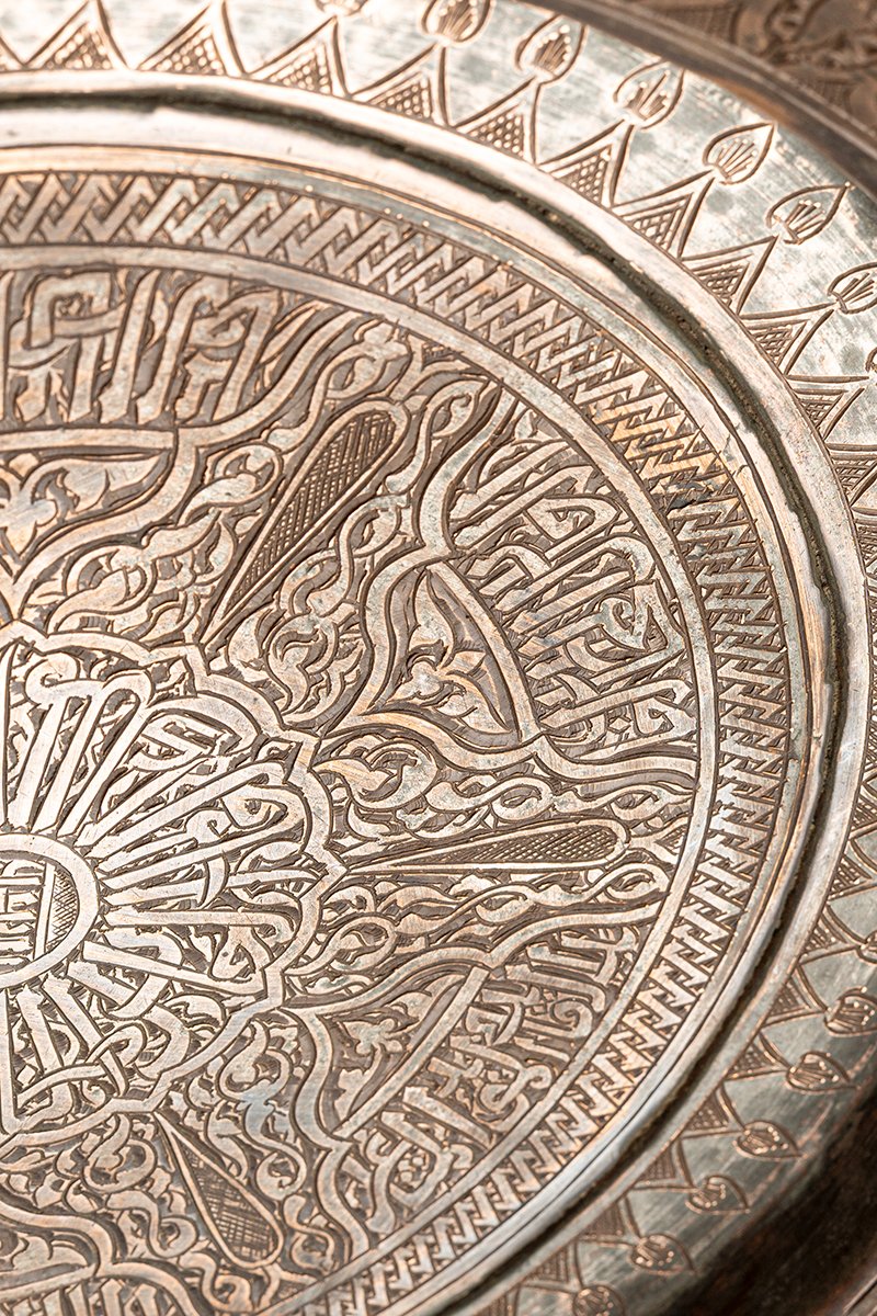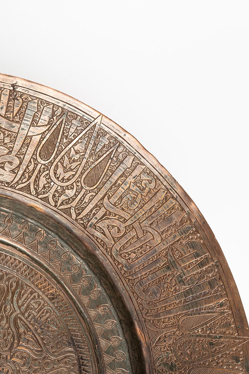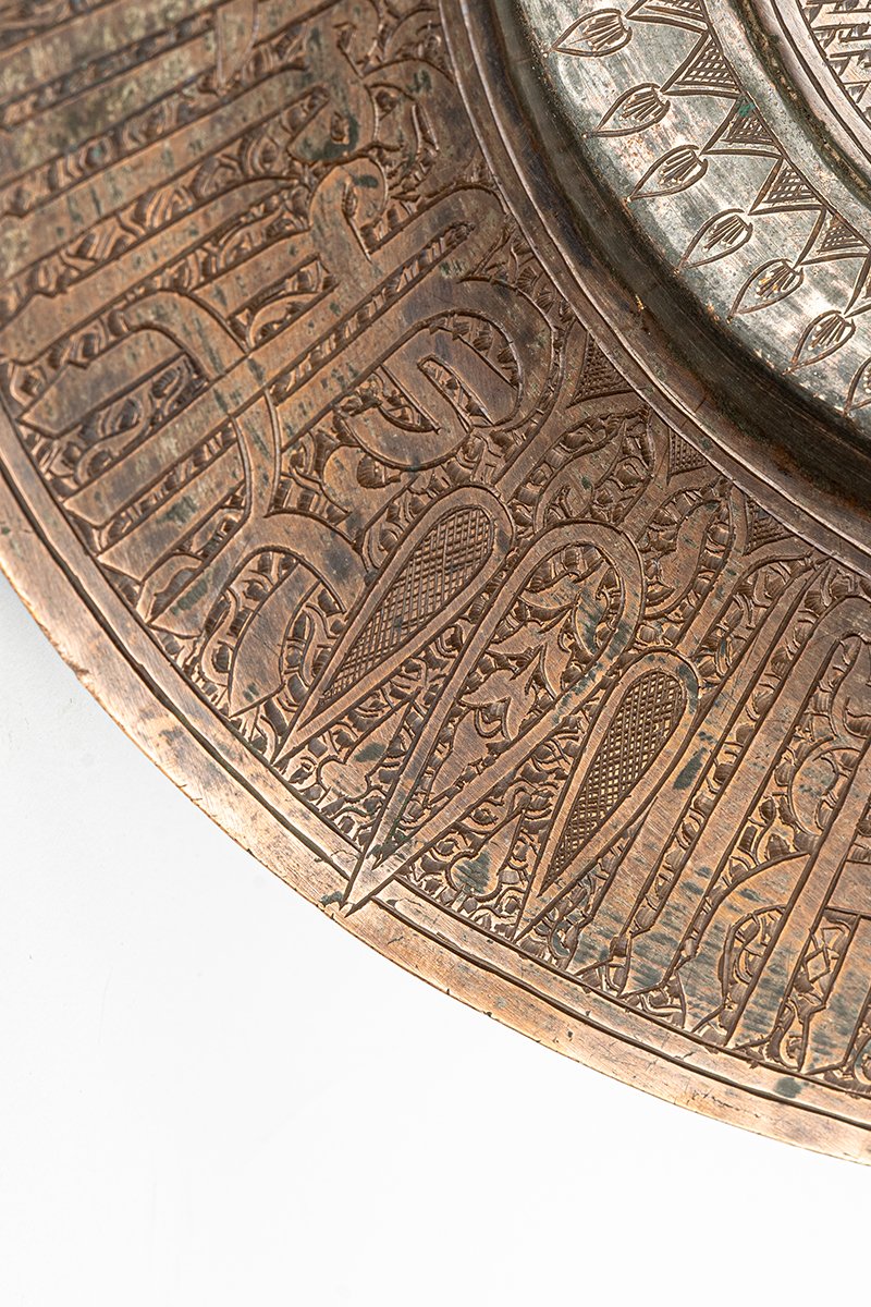 Chargers such as this were objects of prestige and devotion, often presented as elite gifts or commissioned as waqf (religious endowments). The interplay of Qur’anic blessing, royal praise, and luminous ornament situates the Sultan at the axis of light and authority. The charger thus embodies both ceremonial grandeur and spiritual symbolism, a statement of rulership and piety in metal.