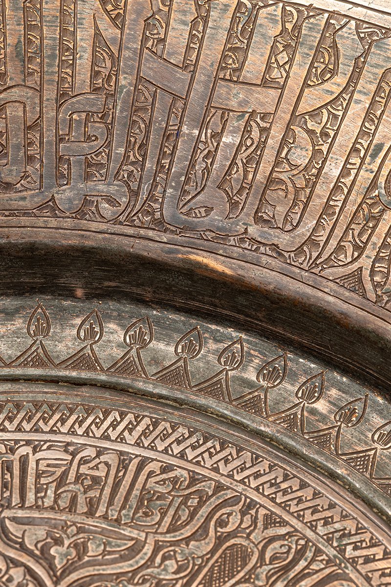 This finely crafted brass charger exemplifies the mastery of Mamluk metalwork, where calligraphy, geometry, and vegetal ornament interlace into a surface of layered meaning. More than a vessel, it served as both a ceremonial object and a proclamation of authority, reflecting the grandeur of the Sultan’s court.
