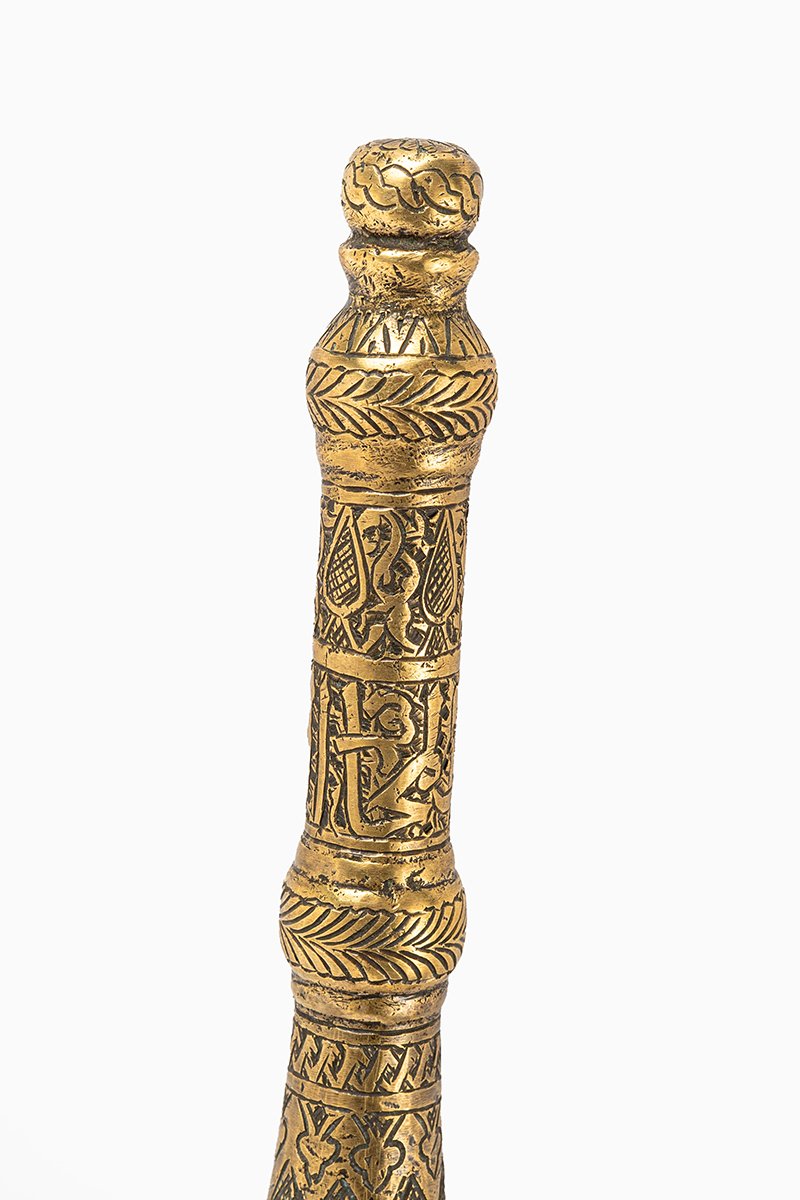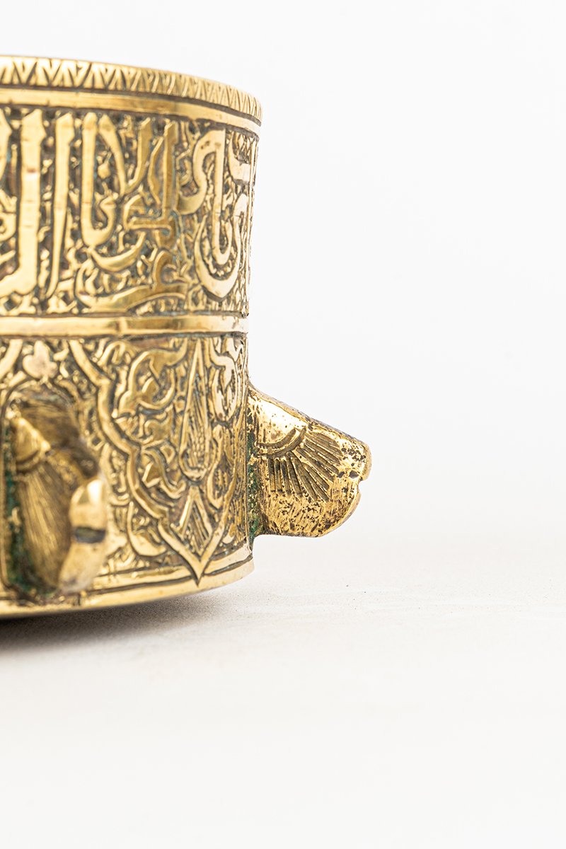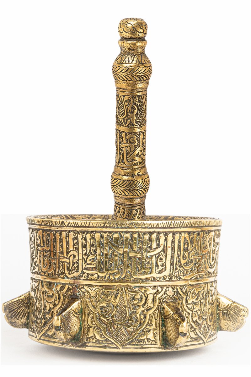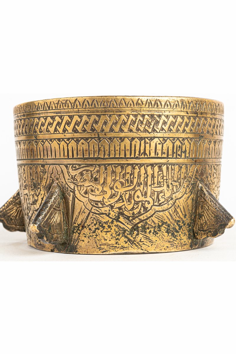 • Mortar Body: The wide cylindrical vessel is adorned with geometric interlace and calligraphic bands, binding symmetry with royal proclamation.
