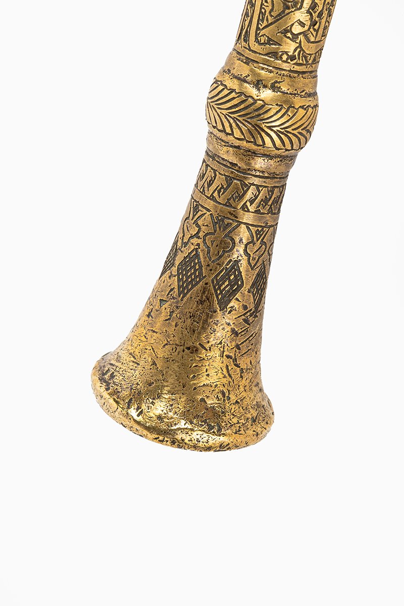 • Pestle: The flared pestle is engraved with interwoven arabesques, calligraphy, and floral medallions, matching the vessel in artistry.