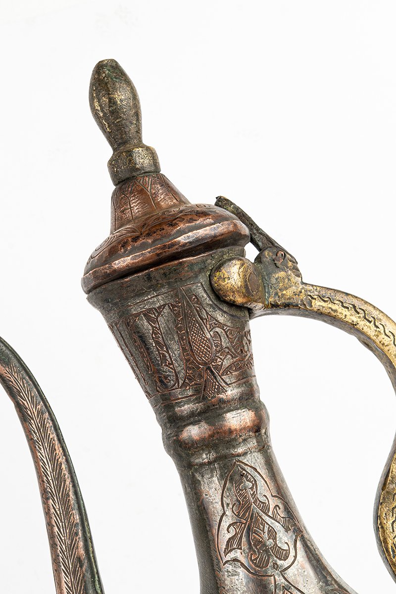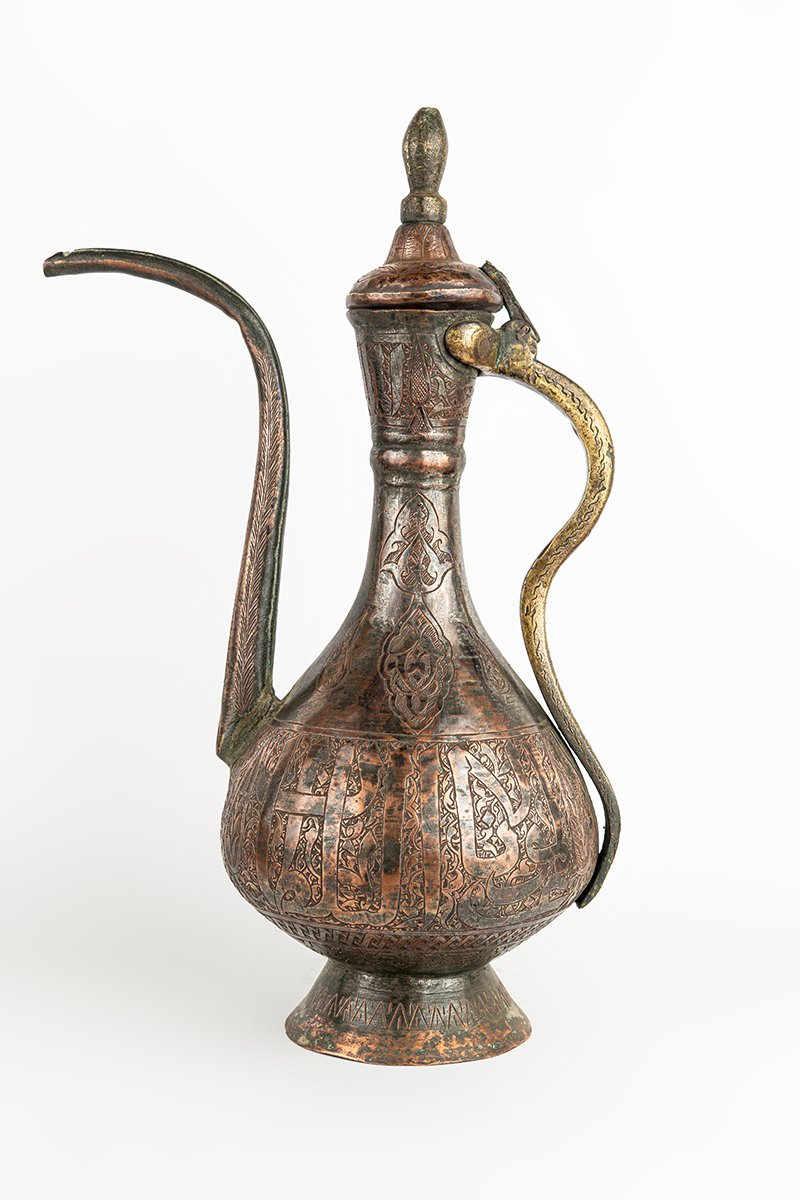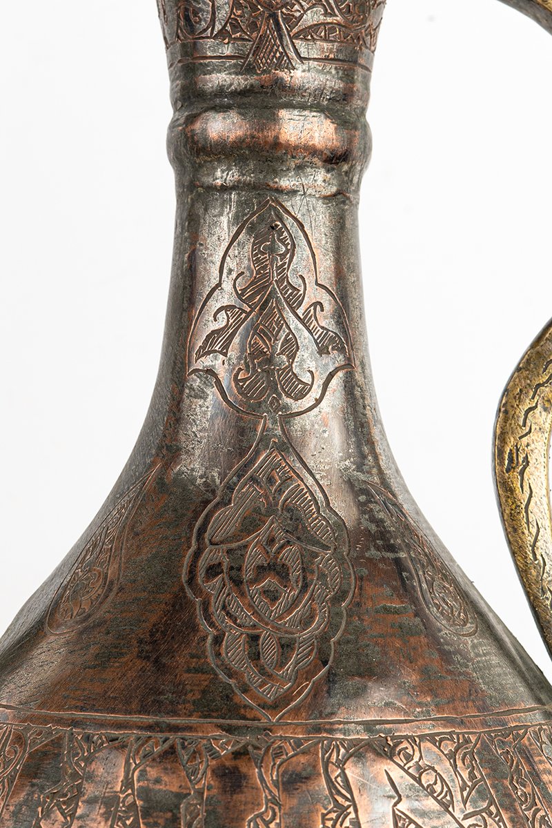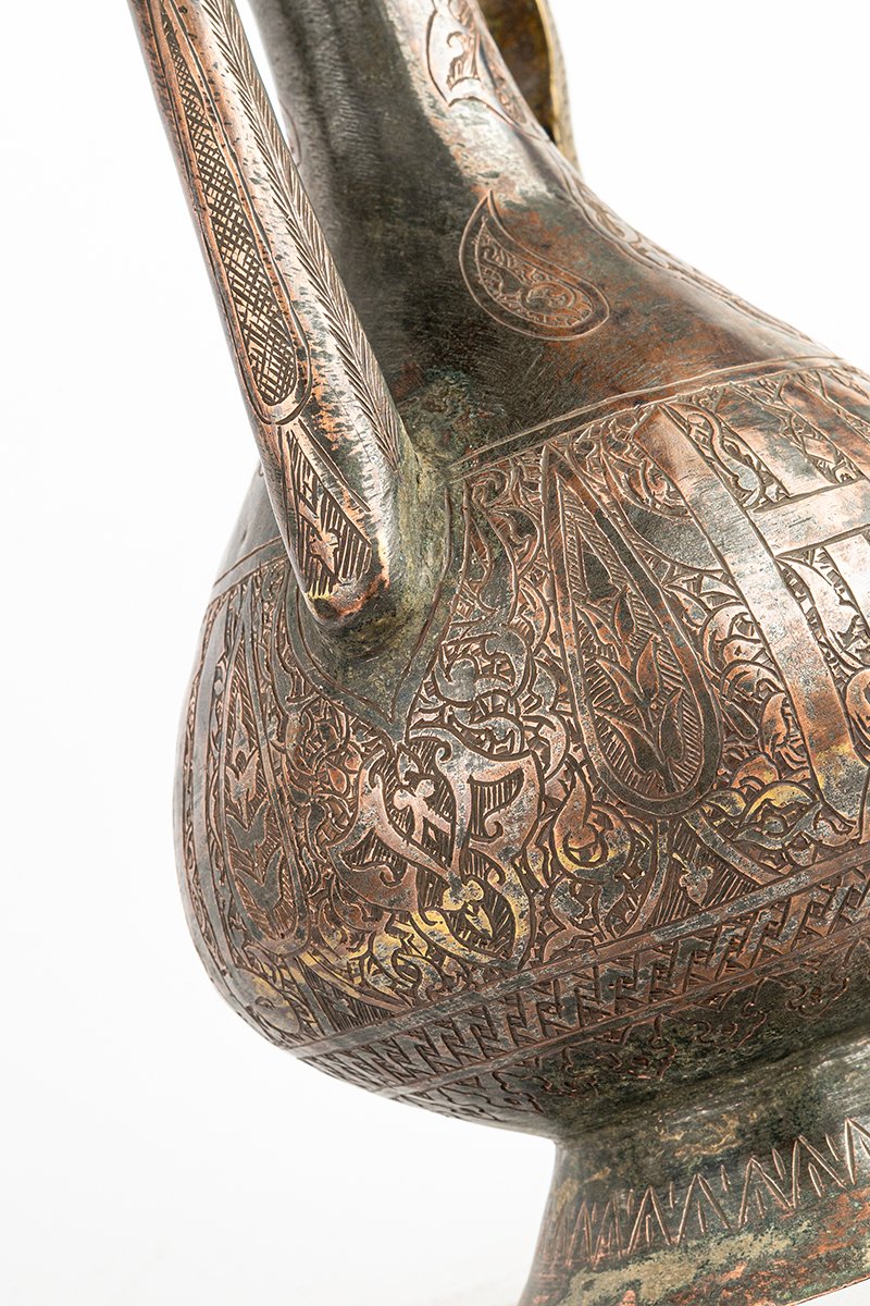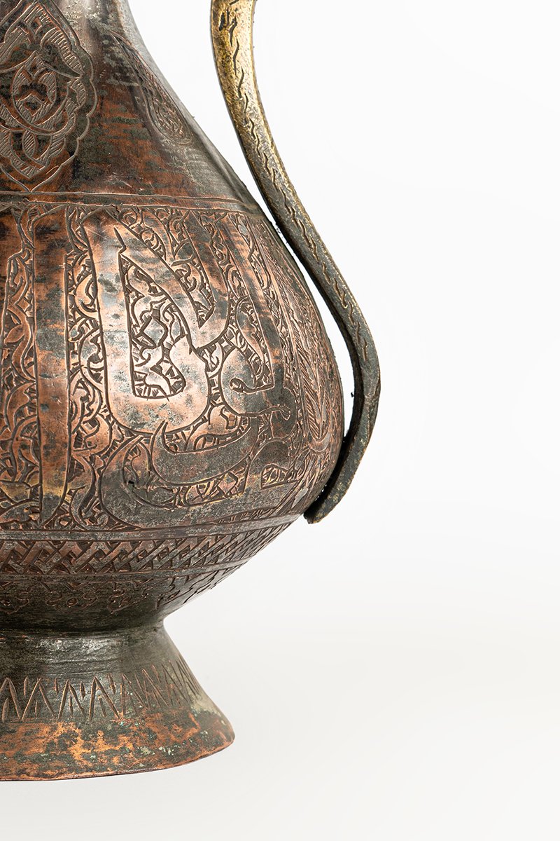 This ewer is more than a functional vessel; it is a statement of prestige and devotion. The inscriptions proclaim the Sultan’s virtues, while the ornament transforms utility into art. Its engraved body unites calligraphy, geometry, and foliage into a rhythmic harmony, making the vessel itself a bearer of blessing, power, and refinement.