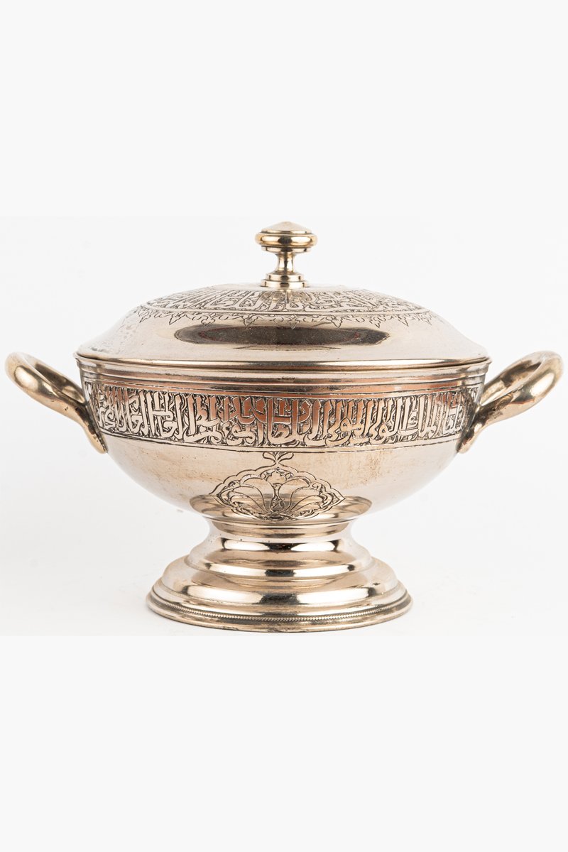 This lidded vessel is a refined example of Islamic metalwork, where elegance, devotion, and craftsmanship converge. Cast in gleaming brass with a polished surface, it rises from a wide pedestal base, its form enriched by twin handles and crowned with a domed lid. Every element balances utility with ornament, transforming a container into a ceremonial proclamation.