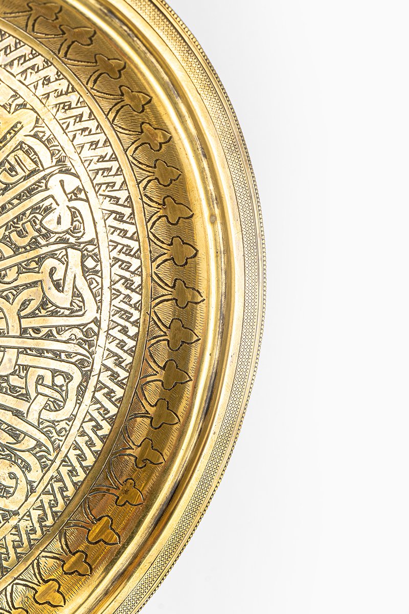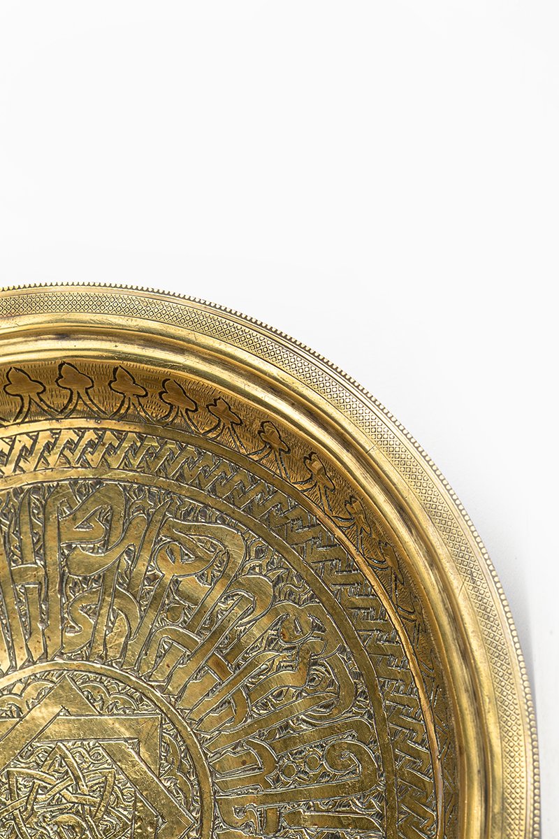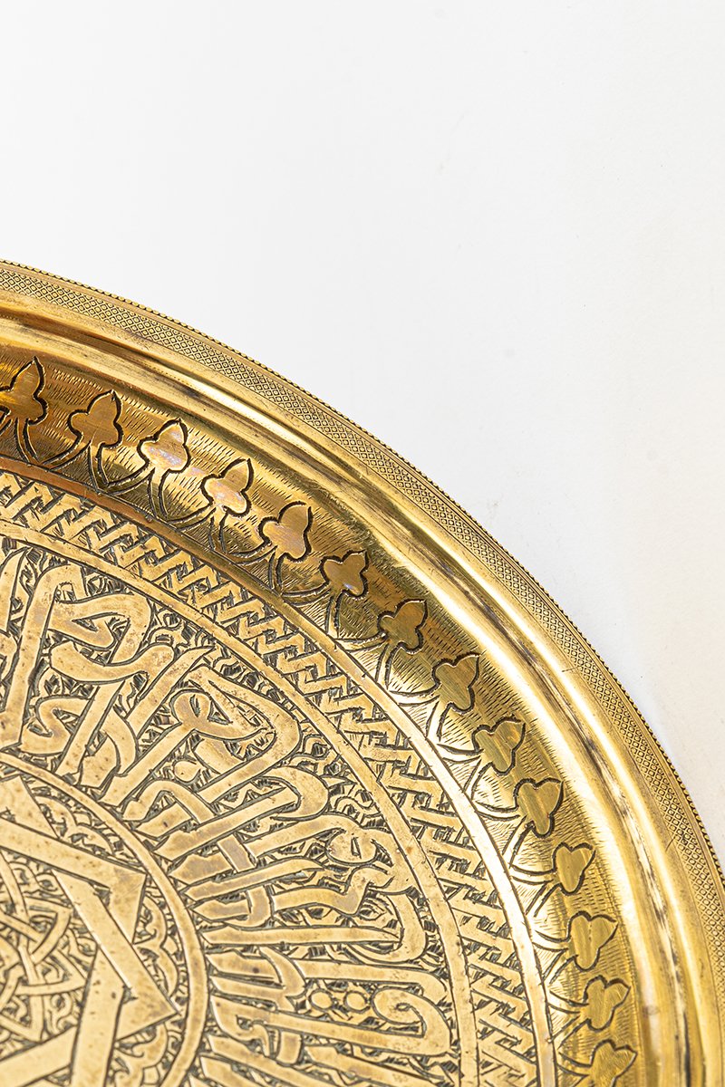 This radiant brass charger, finished in a golden gleam, exemplifies the splendor of Fatimid–Mamluk metalwork. Its wide surface is a canvas of geometry and calligraphy, transforming brass into a proclamation of unity, divine wisdom, and enduring strength.