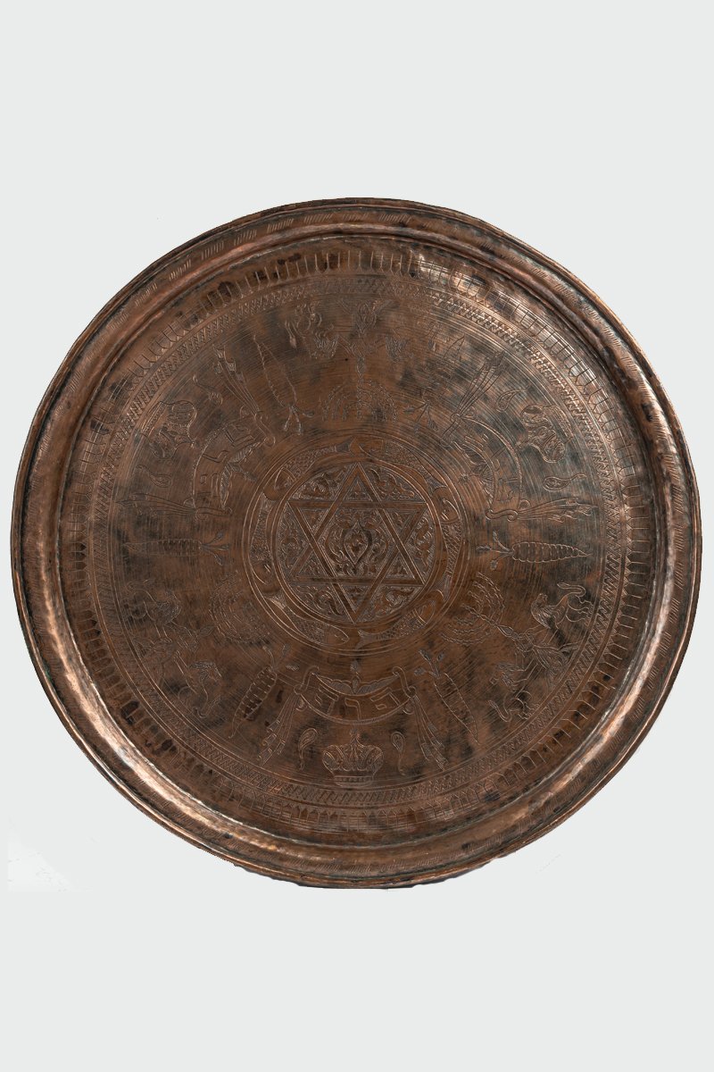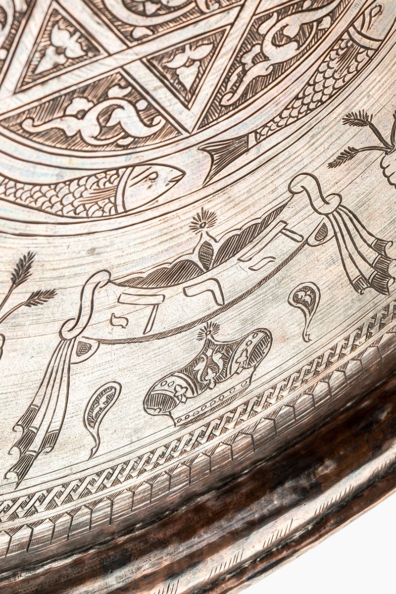 This tray is a rare example of Egyptian Jewish ceremonial artistry, blending Islamic-Mamluk arabesques with Judaic symbols. At its heart, the Star of David unites heaven and earth, while lions, menorahs, and crowns declare divine blessing, justice, and triumph. Fish recall life’s abundance and sacred rest, while vines and fruits affirm prosperity. Together, the tray becomes a cosmic proclamation of faith, power, and harmony, where Jewish devotion and Egyptian craftsmanship converge into a masterpiece of cultural symbiosis.