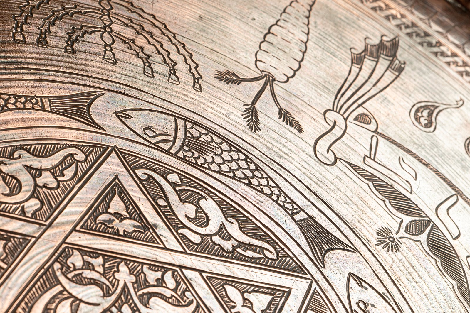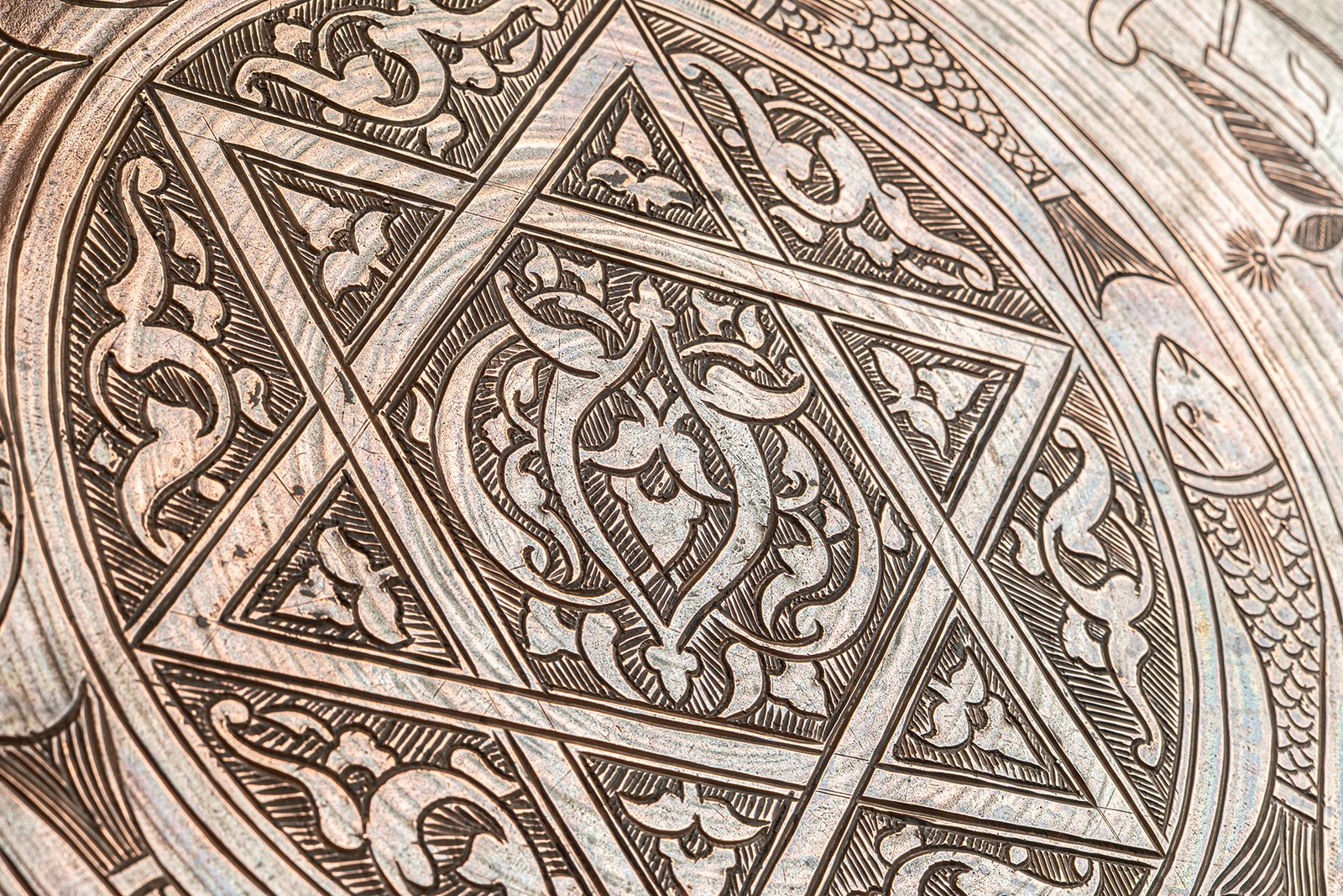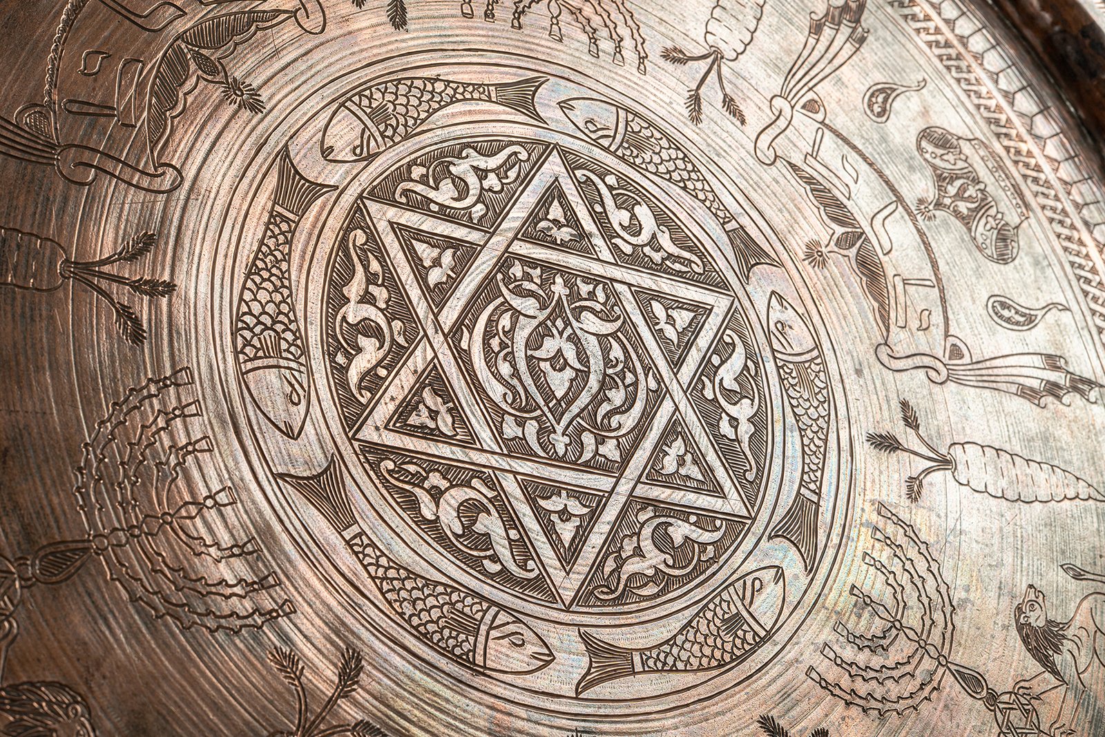 This antique copper tray is anchored by a bold six-pointed star (Magen David – מגן דוד) at its center, interlaced with arabesque motifs that create a sense of eternal balance and unity. The star radiates outward as both a geometric anchor and a spiritual symbol, its symmetry embodying divine order at the heart of worldly complexity. Around it, finely engraved fish motifs swim in a continuous ring, symbols of abundance, sustenance, and the eternal cycles of life.