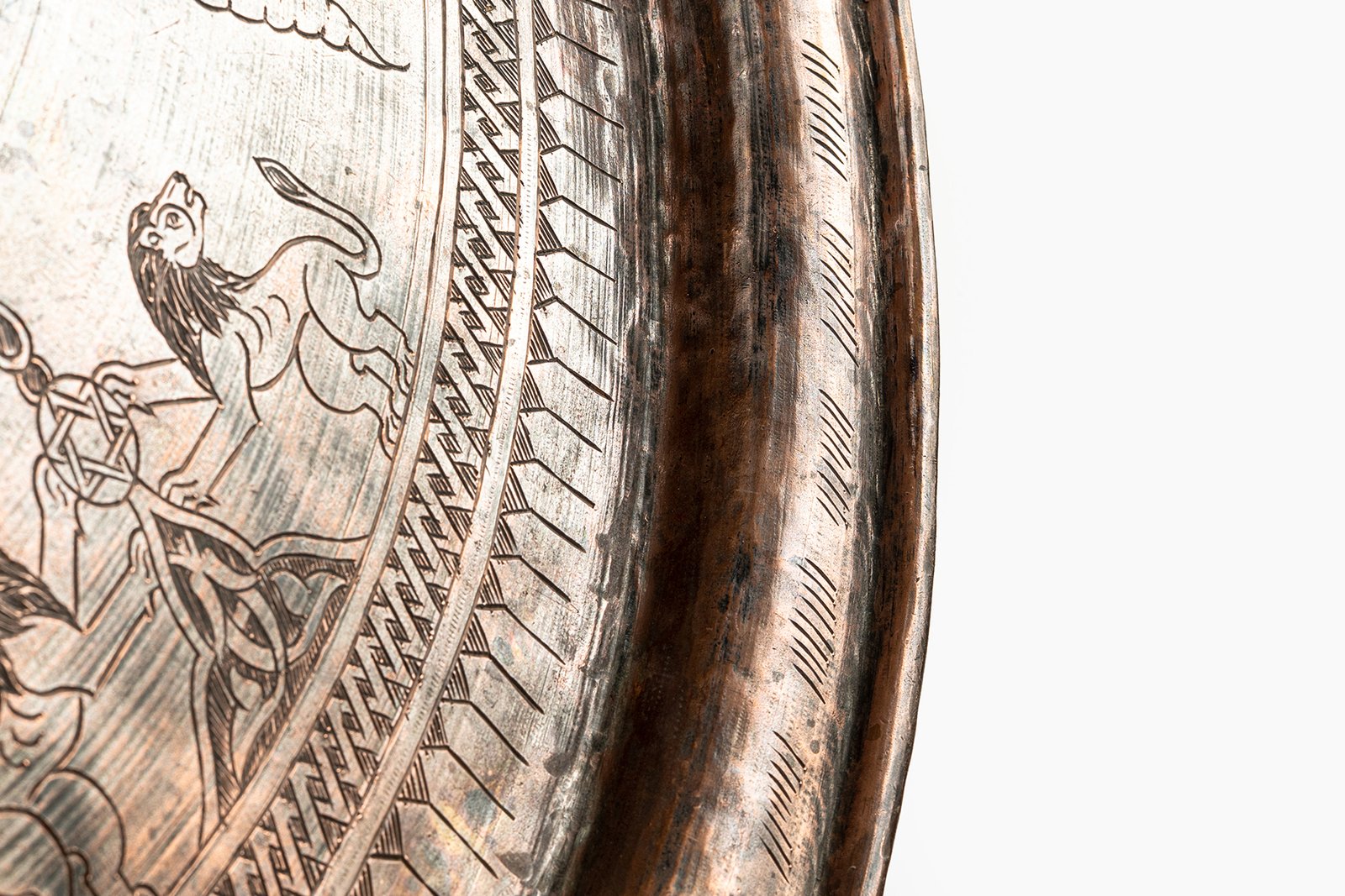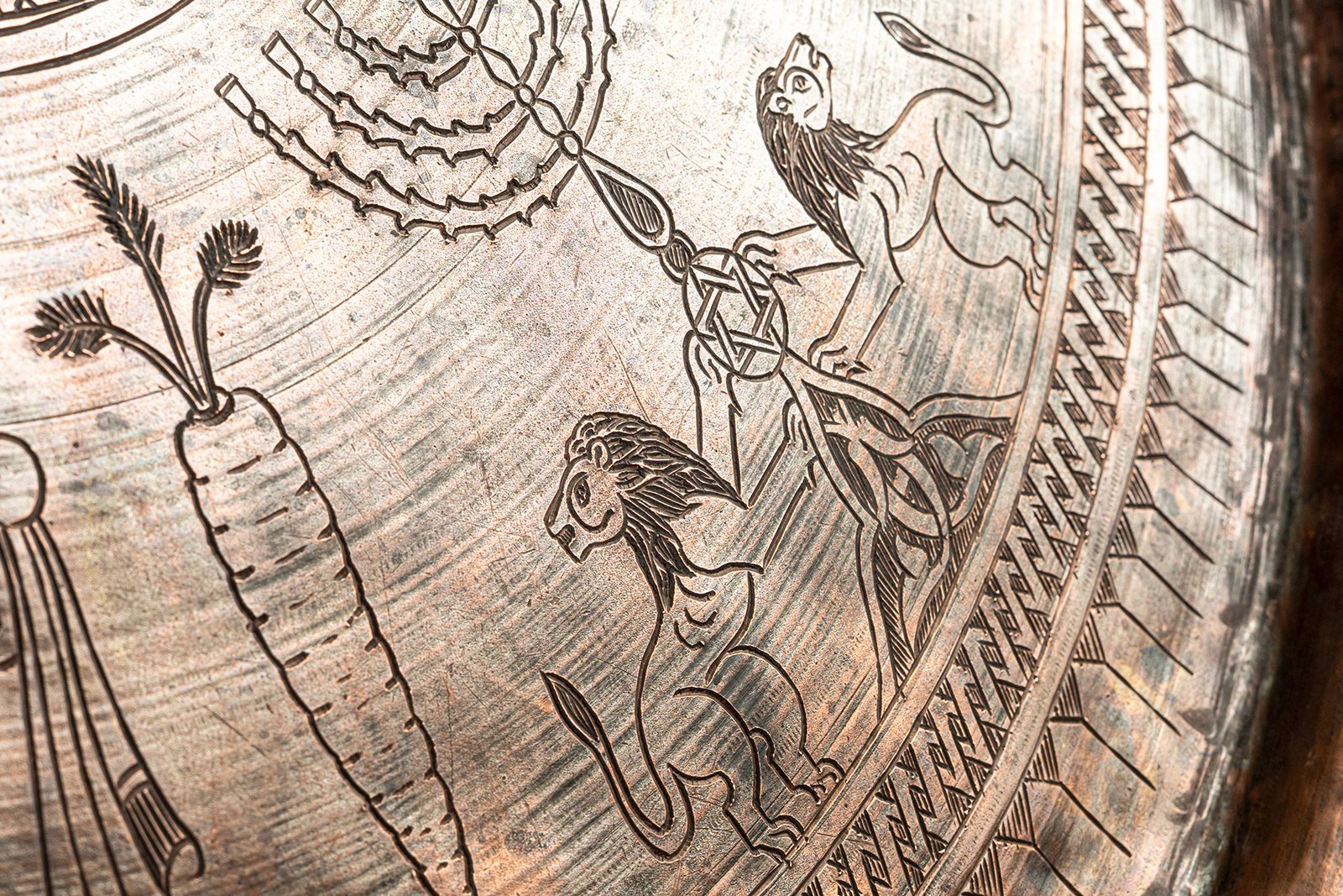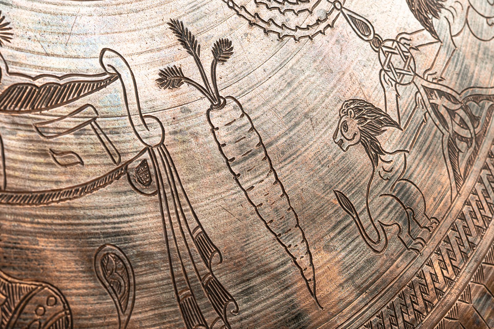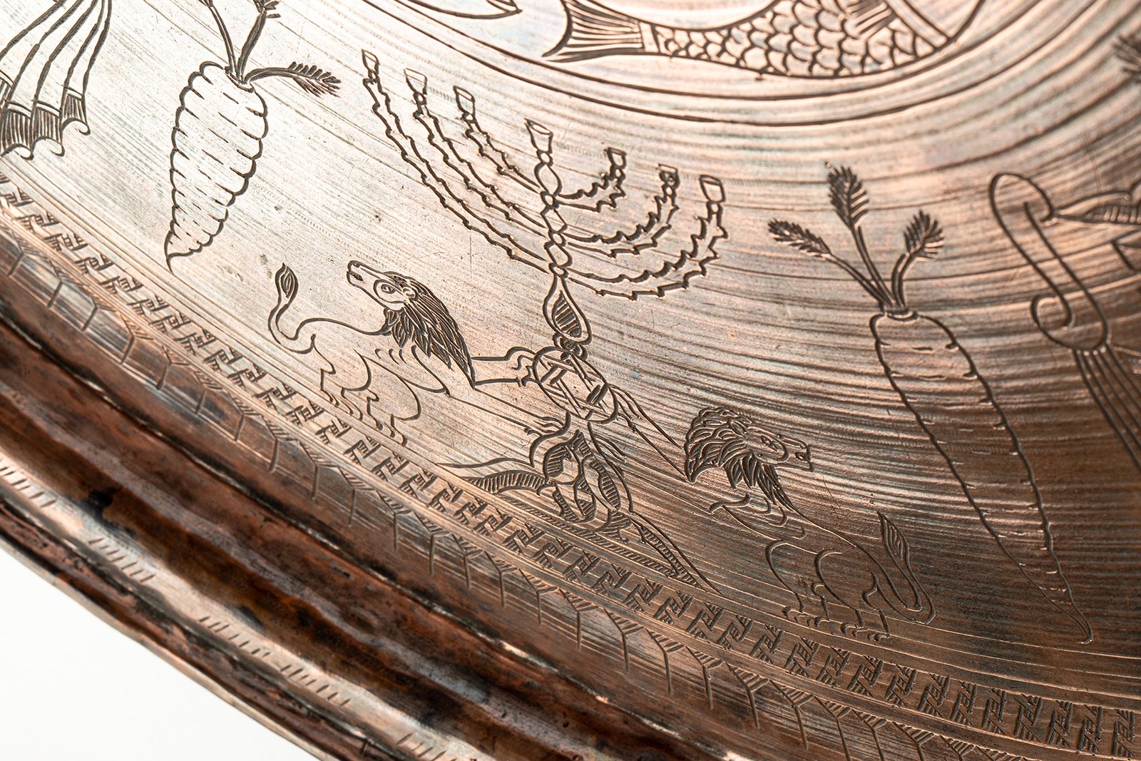 The outer design blossoms with Jewish and Near Eastern symbols: lions stride as guardians of strength and majesty, crowns rise as emblems of sovereignty and triumph, menorah-like candelabras (شمعدان – shamʿadān) shine as lights of faith, while fruits, plants, and banners evoke prosperity and celebration. The engravings unite sacred and worldly motifs, forming a visual tapestry of cosmic harmony and earthly power.