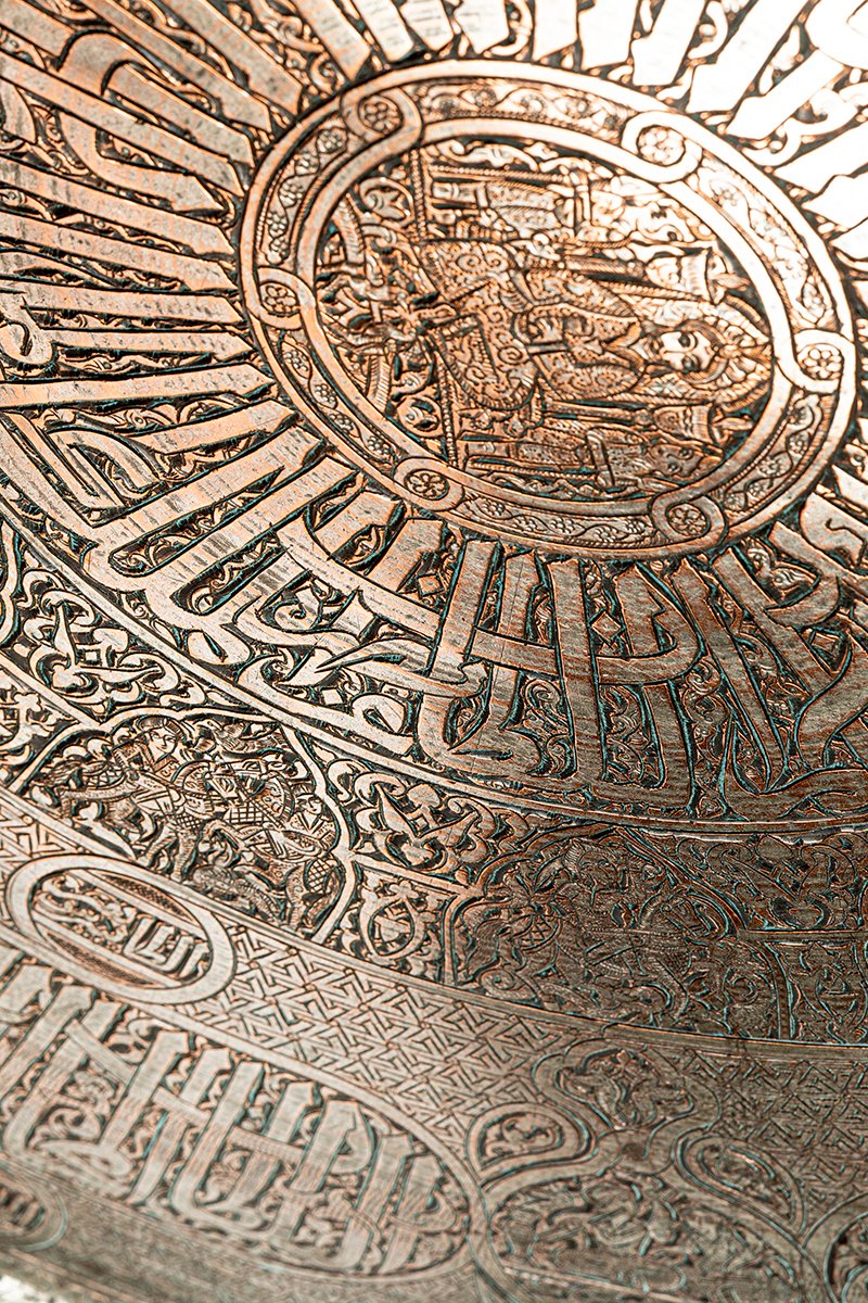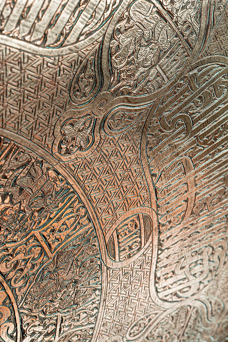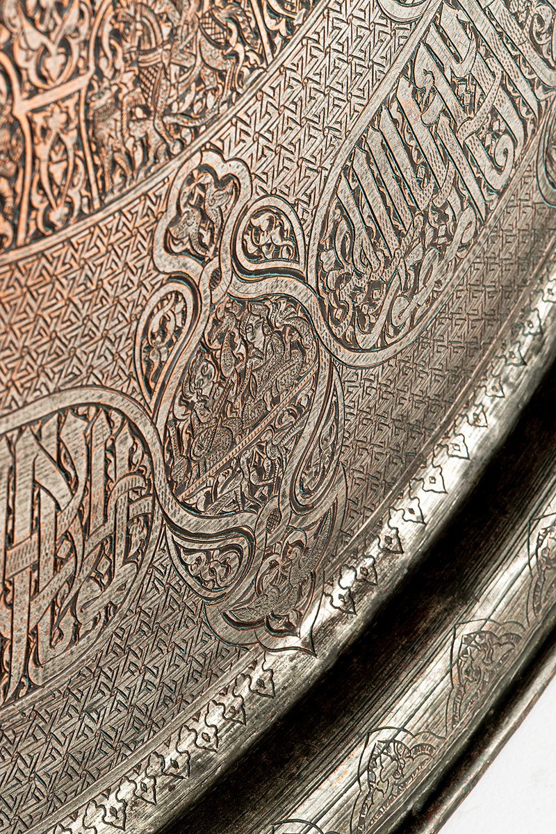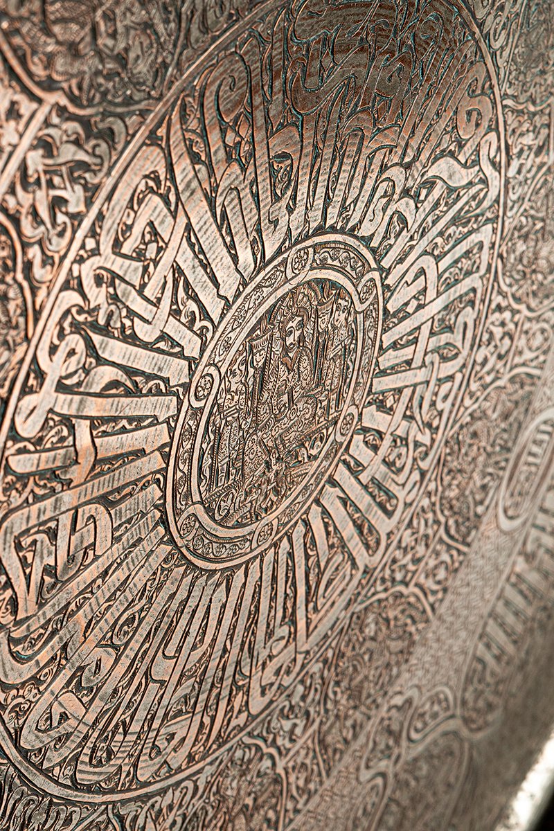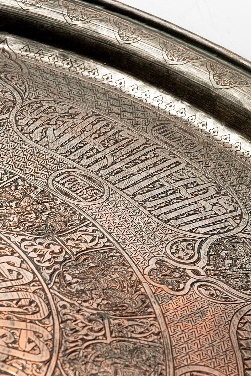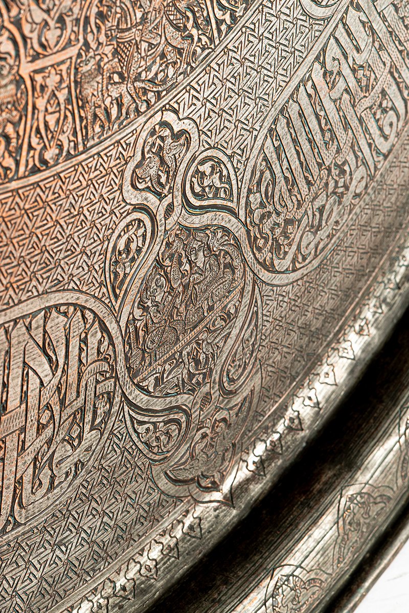 This tray presents a vision of a kingdom in balance: the Sultan enthroned at the center, his twelve knights embodying the strength and character of the provinces, and the outer registers alive with music, festivity, and harmony. Lions, birds, and human figures animate the surface, reflecting a world both vigorous and joyful. Through calligraphy, geometry, and imagery, the tray becomes a proclamation of sovereignty and celebration, a reminder that under the Sultan’s reign, justice, power, and harmony resonate like music within a cosmic order.