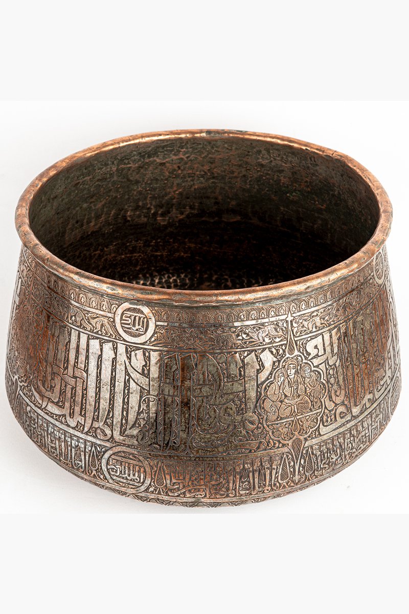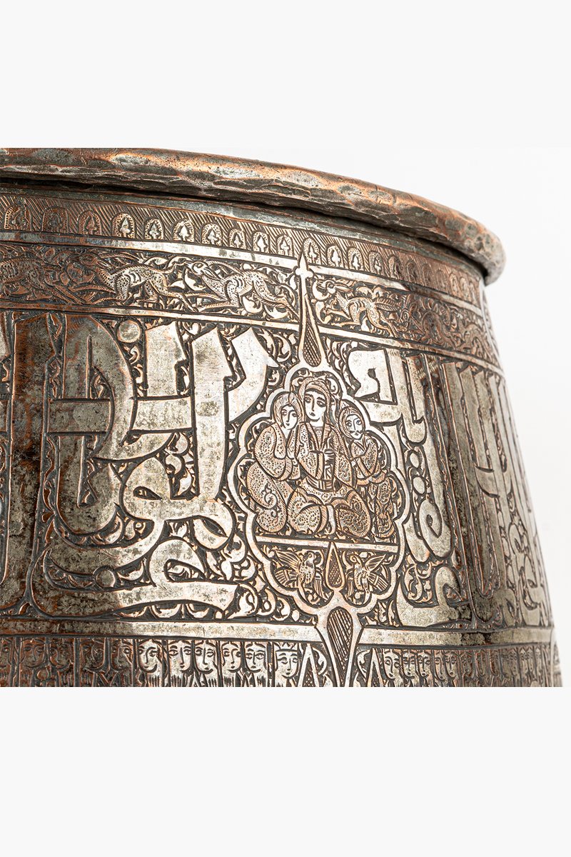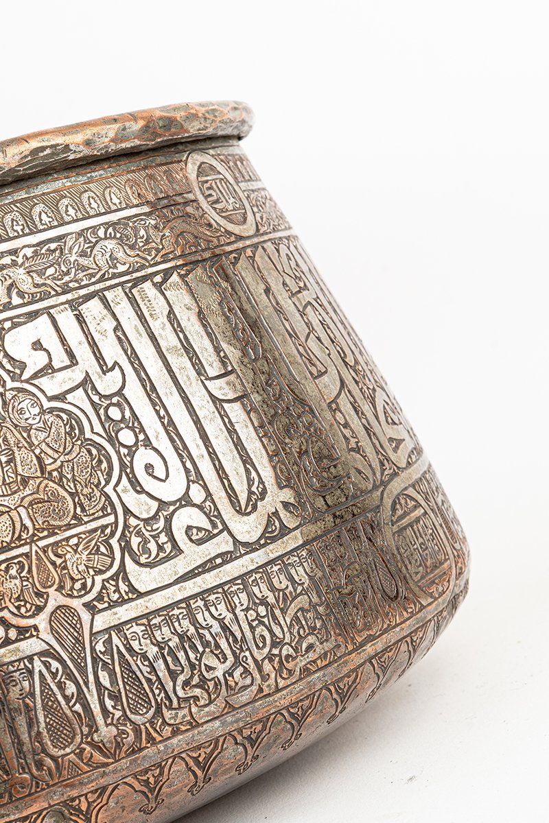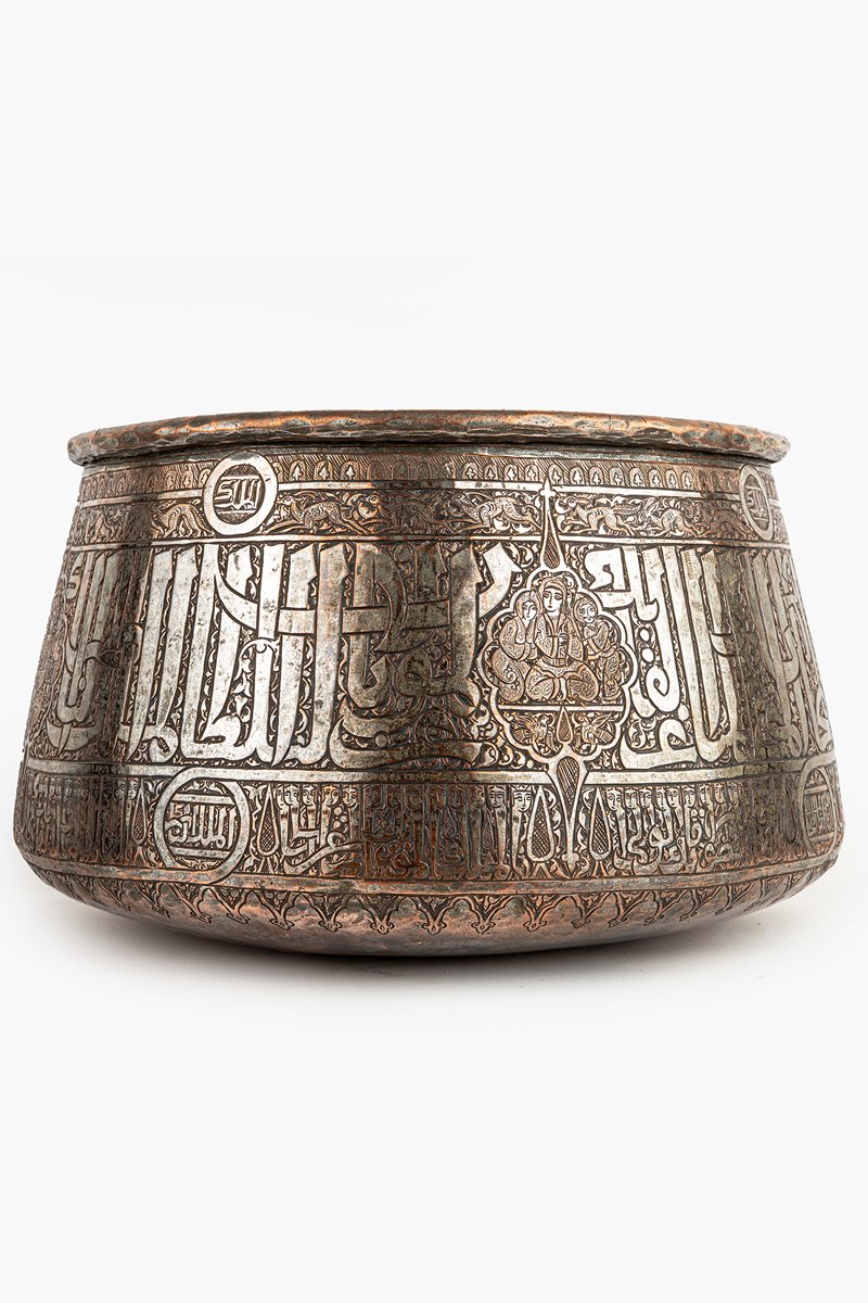 This vessel unfolds like a dense manuscript in metal, where inscription, figural imagery, and symbolic ornament are interlaced into one continuous dialogue. Its surface is structured by broad registers of text and medallions, each framing scenes of authority, devotion, and divine order.