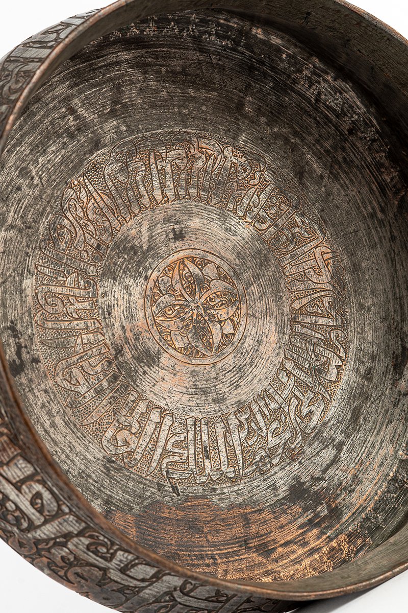 The calligraphy appears in concentric bands, engraved along the rim, woven into the inner medallions, and even inscribed on the base, hidden blessings meant to protect and inspire.