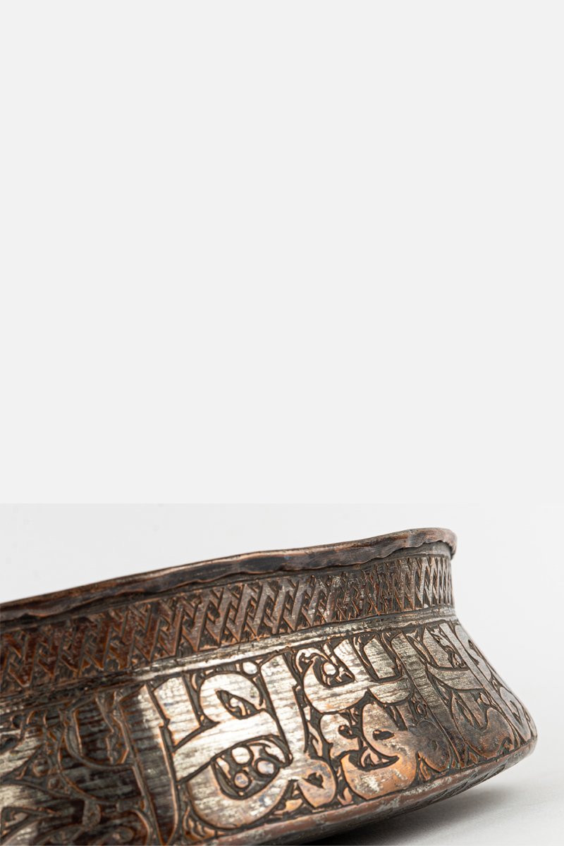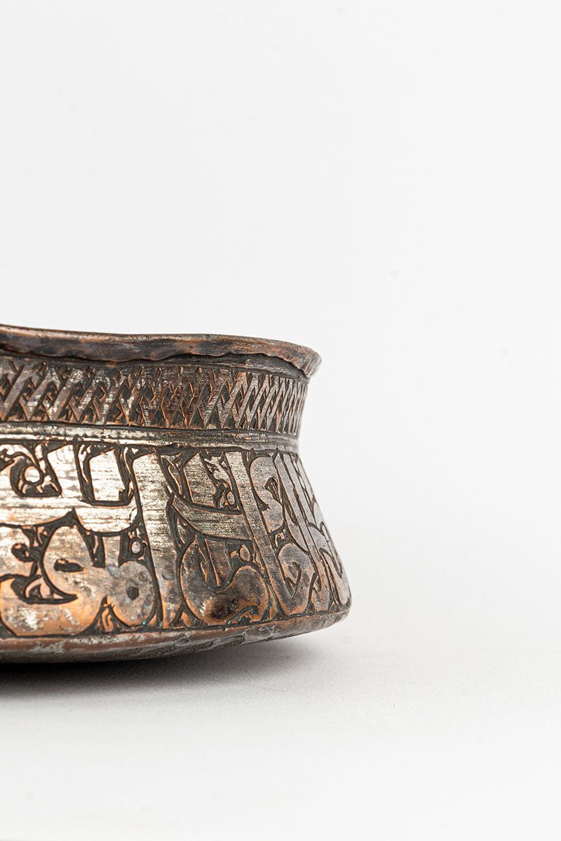 - Exterior Bands: Bold bands of silver-inlaid calligraphy alternate with framed geometric braid-like patterns, their contrast alive against the copper ground.