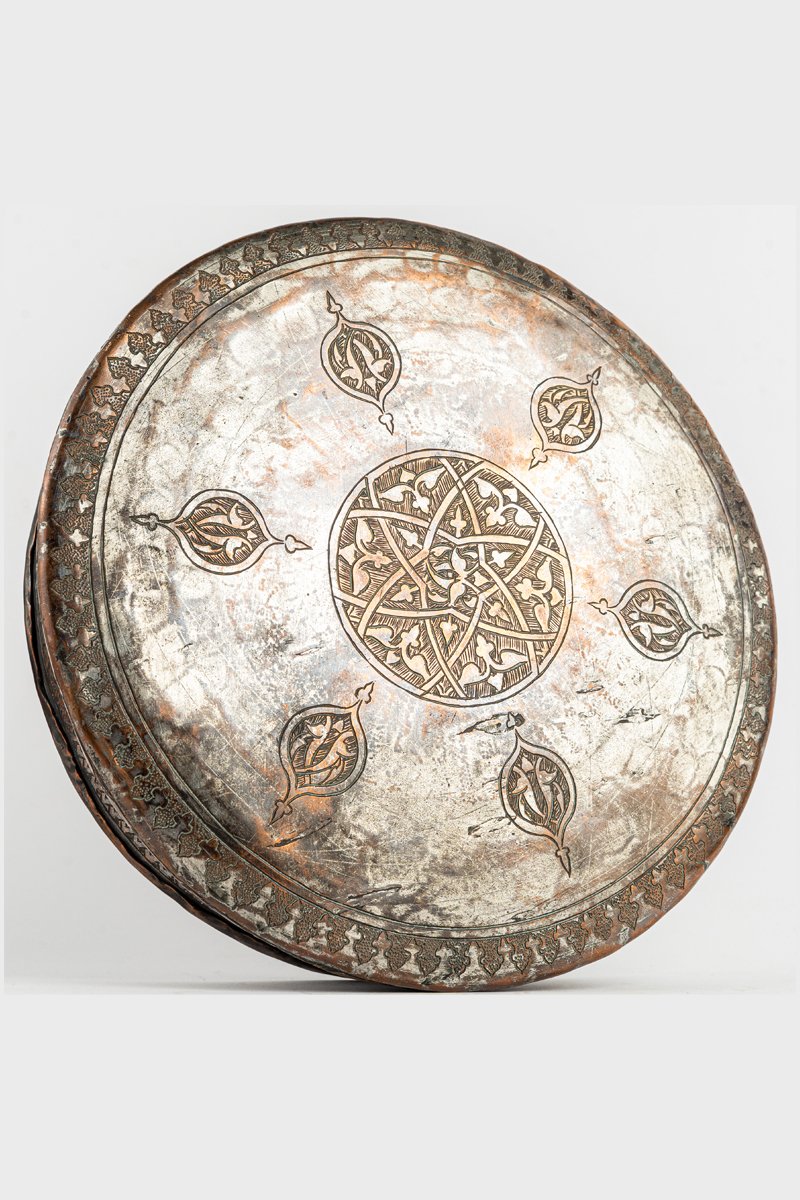 This shallow basin reveals its artistry through balance, subtlety, and detail. Forged in copper with luminous silver inlay, it carries both functional strength and layers of ornament that elevate it into a ceremonial object. Its flared profile, wide mouth, and warm body form the foundation for a surface where every plane, inside, outside, and even beneath, was given the hand of the engraver.