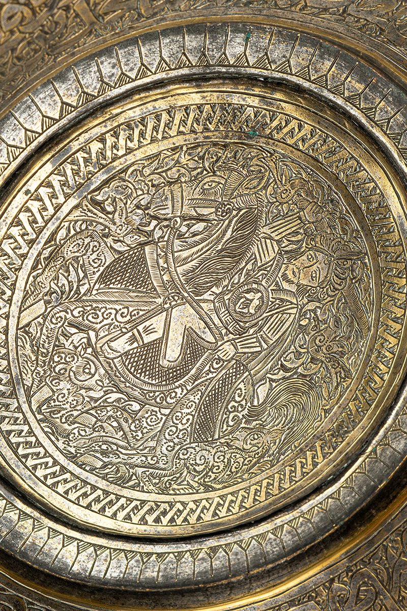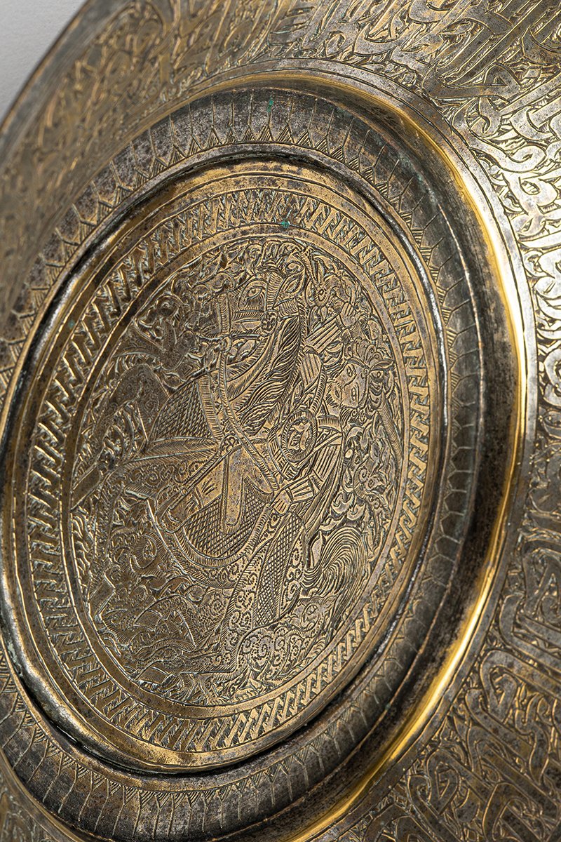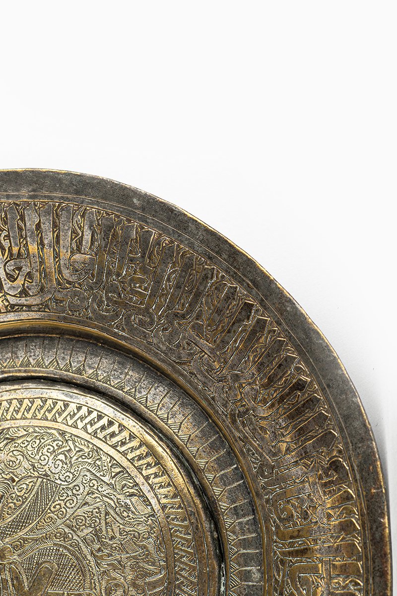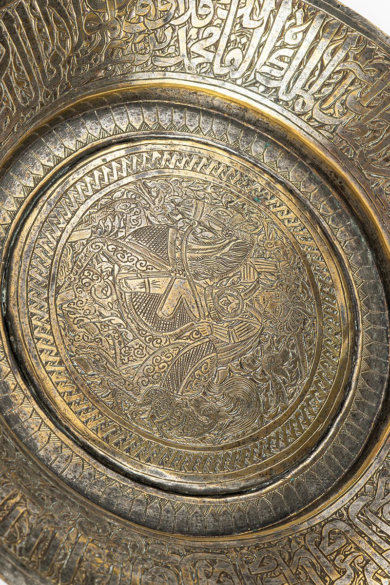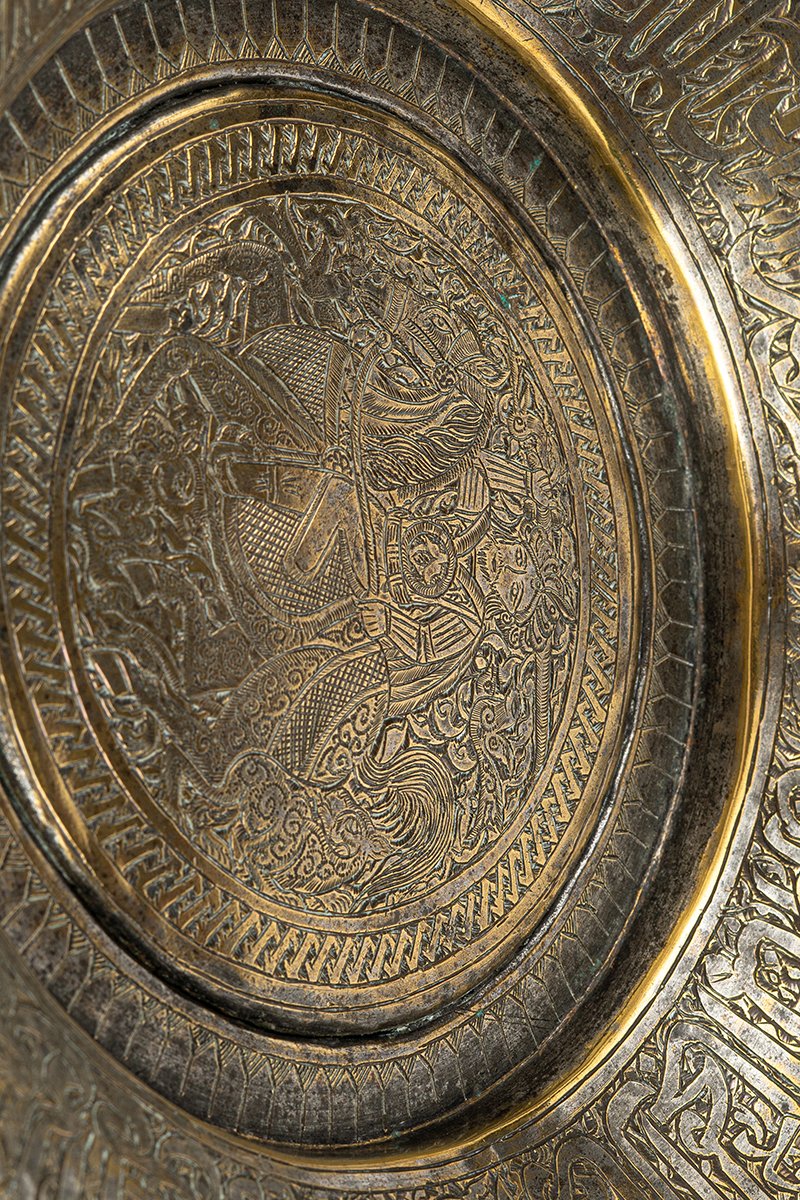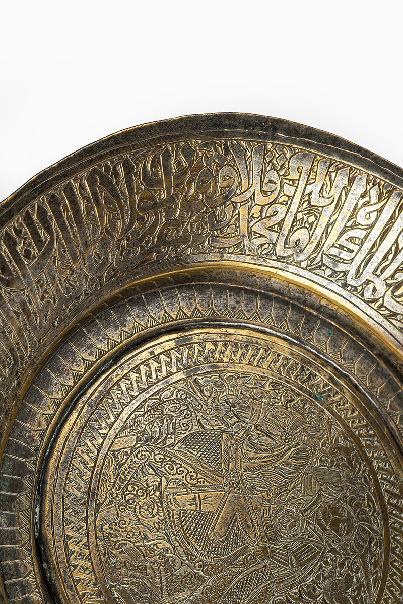 This charger would have been displayed in a noble or courtly setting, projecting both prestige and piety. The mounted figure of the Sultan anchors the piece in martial triumph, while the radiating Qur’anic and honorific inscriptions proclaim divine blessing and legitimacy. It is at once a commemoration of conquest and a devotional object, a masterpiece of Mamluk ceremonial artistry.