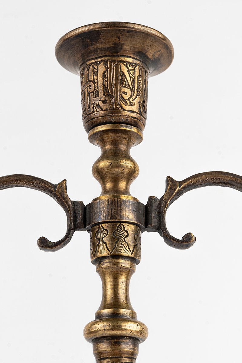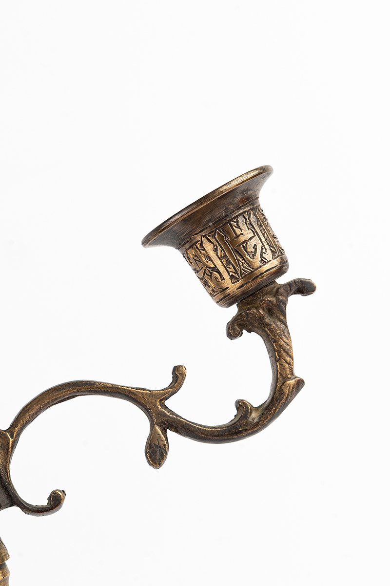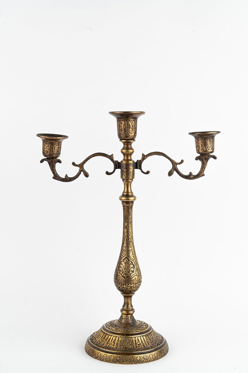 This brass candelabrum rises with a presence that is both architectural and organic, conceived not only to hold flame but to embody it. Every section, from the inscribed base to the branching arms, carries artistry and meaning, turning light into ritual and metal into memory.