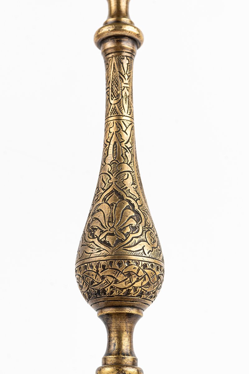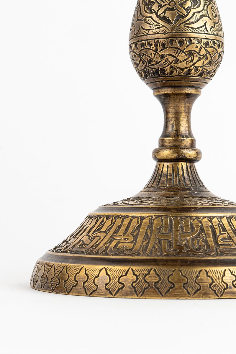 This candelabrum is both functional and ceremonial, uniting flame and inscription into one dialogue. By design, it transforms in use: light activates its script, shadows animate its arabesques, and the object itself becomes a living bearer of ritual. The praises to Sultan al-Muʾayyad root it in authority, while its harmony of geometry, floral ornament, and branching form reflects a philosophy where illumination, memory, and meaning converge.